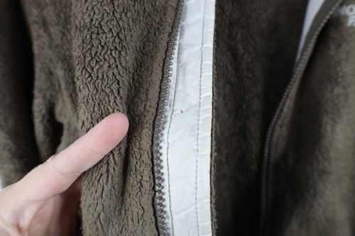 Stain front inner zipper flap, collar. Discoloring collar, inner zipper flap, inner lining. Loose thread right cuff. Logos distressed. Color faded. Pilling, fabric matted. Zipper pull distressed