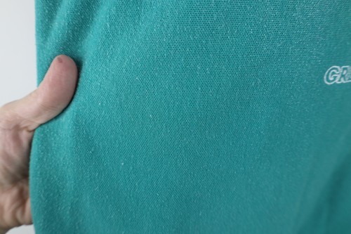 Dark spots front, back. Collar, cuffs, bottom discolored. Graphics, color faded. Tag faded. Pilling. Made in USA