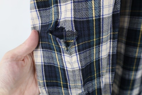 Hole/ripped right arm. Collar, cuffs discolored. Color faded. Pilling
