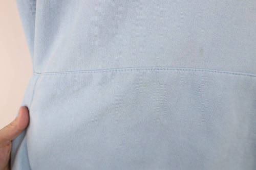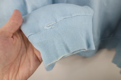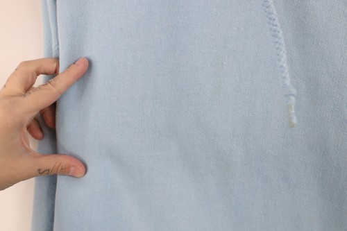Stains front, pocket, arms. Bleach stains, loose thread right cuff. Loose thread pocket. String distressed. plastic pieces cracked. Hood, cuffs discolored. Color faded. Pilling