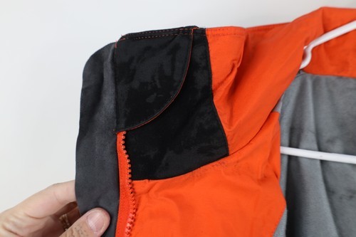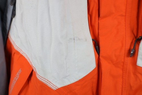 Black material on the inner neck flap is peeling and coming off inside. AS IS. Stains throughout, and collar, cuffs, inner lining. Missing hood, inner lining. Inner zipper flap distressed/blemished. Inner lining pilled/stained. Collar, cuffs discolored. Color faded