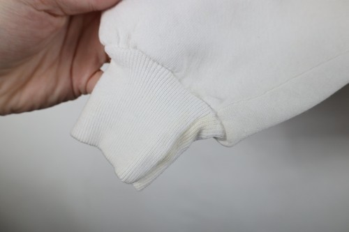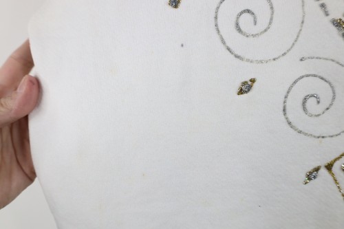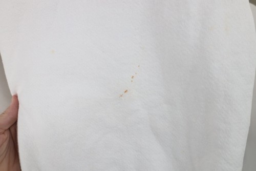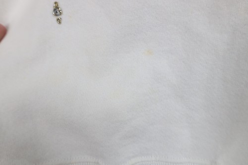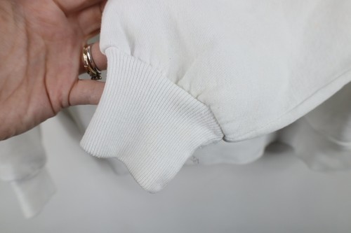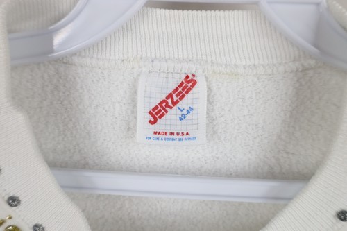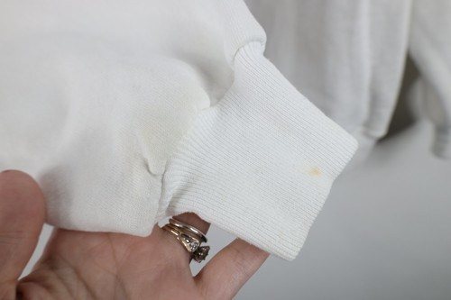 Stains/yellow spots thoughout, and cuffs. Collar, arms/cuffs discolored. Yellowed. Puff paint graphics peeling/distressed. Pilling. Made in USA