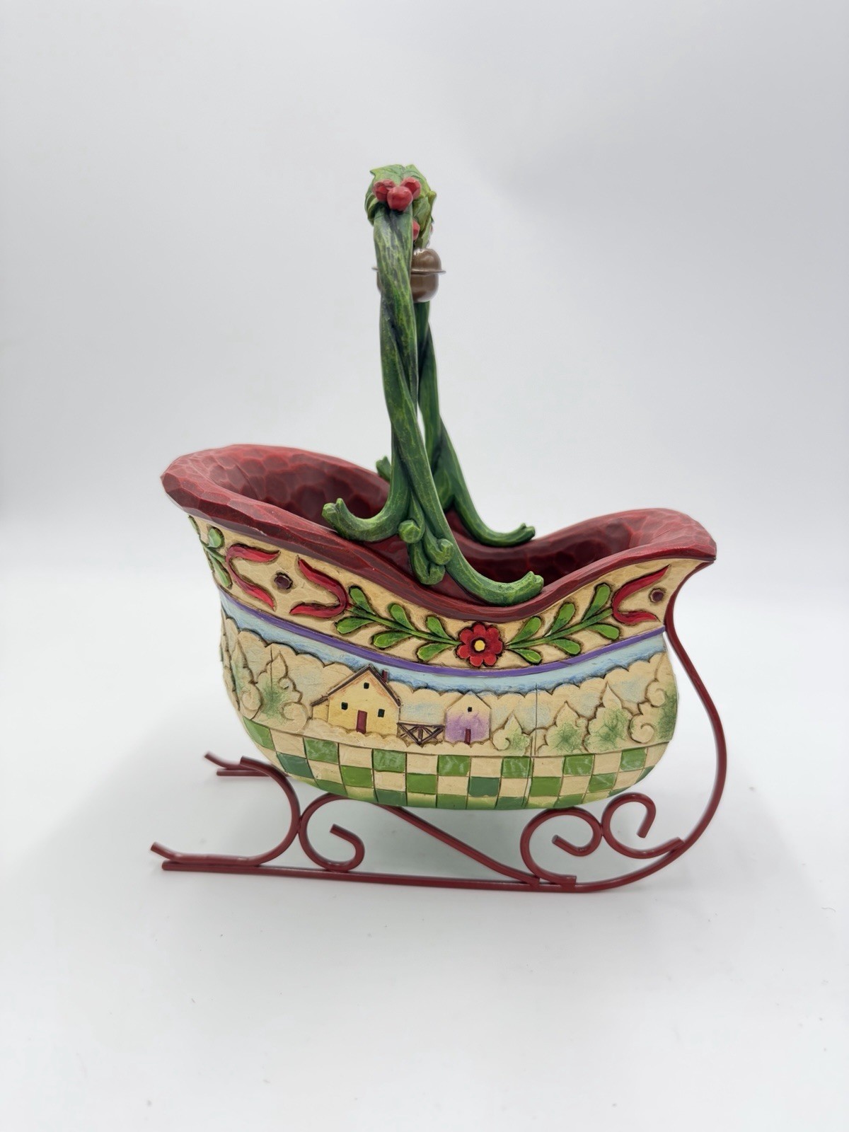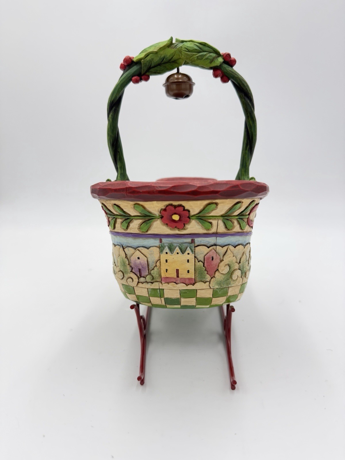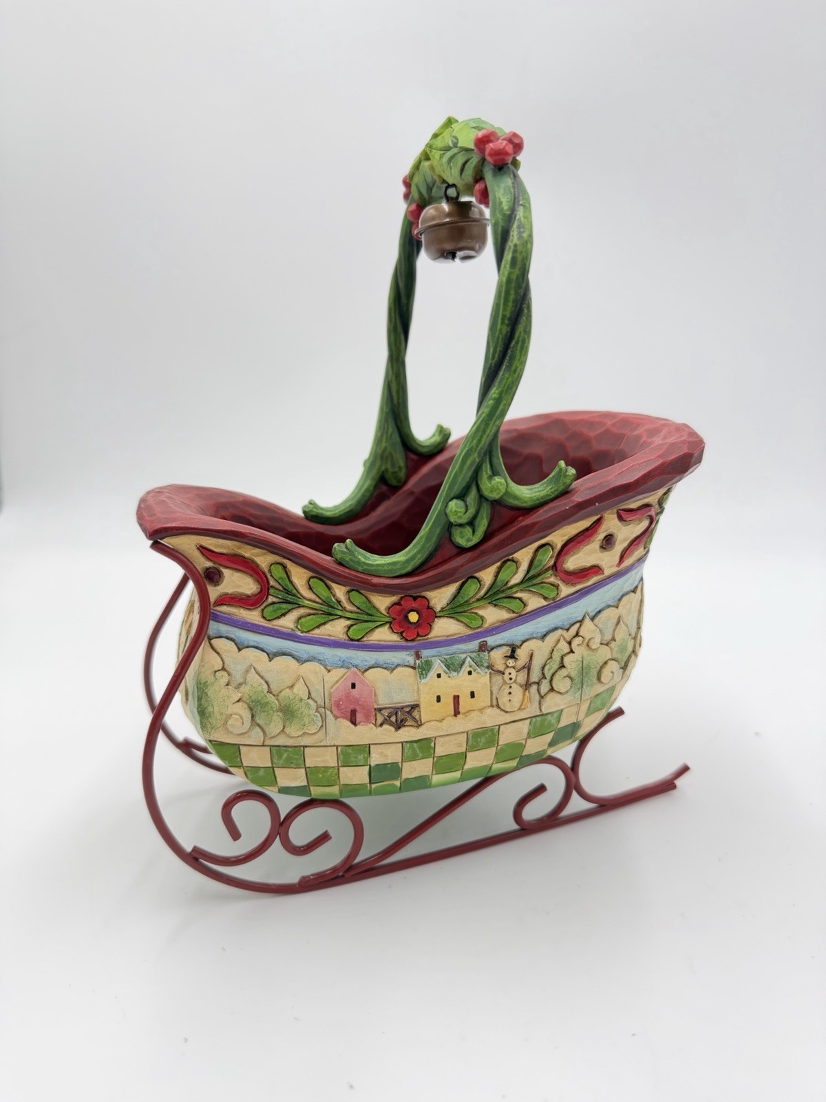 The Jim Shore Heartwood Creek Sleigh Bells Ring Christmas Tabletop Figurine is a charming and whimsical addition to any holiday decor collection. This medium-sized, multicolor resin figurine features a sleigh shape perfect for celebrating the Christmas season. The sleigh figurine is part of the Heartwood Creek collection by Jim Shore, known for its intricate designs and nostalgic themes. Standing at 8 inches tall, this original piece from 2007 adds a touch of magic to any tabletop display.