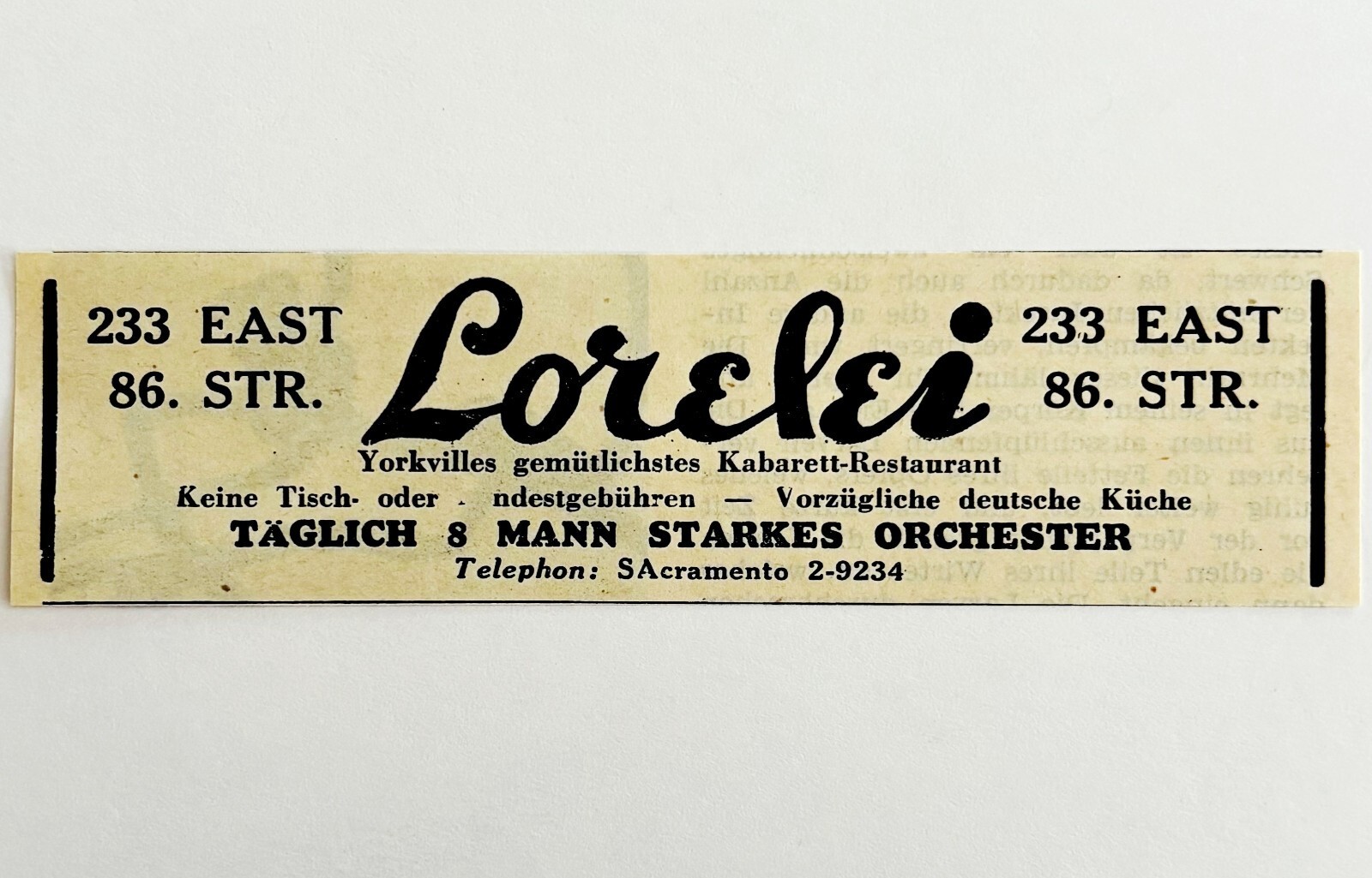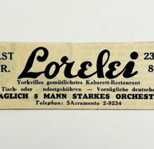 1945 WW2 German-USA Restaurant Advertisement Lorelei Cabaret Music NYC C94D