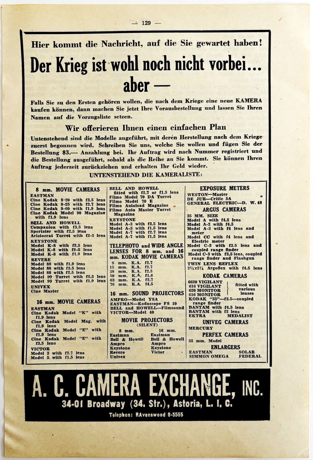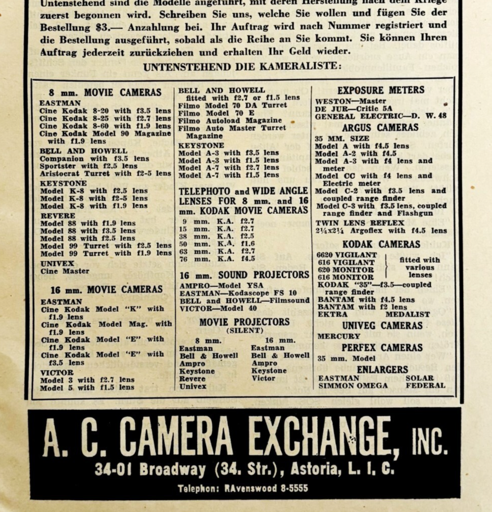 1945 WW2 German-USA Photography Store Advertisement A.C. Camera NYC C94E