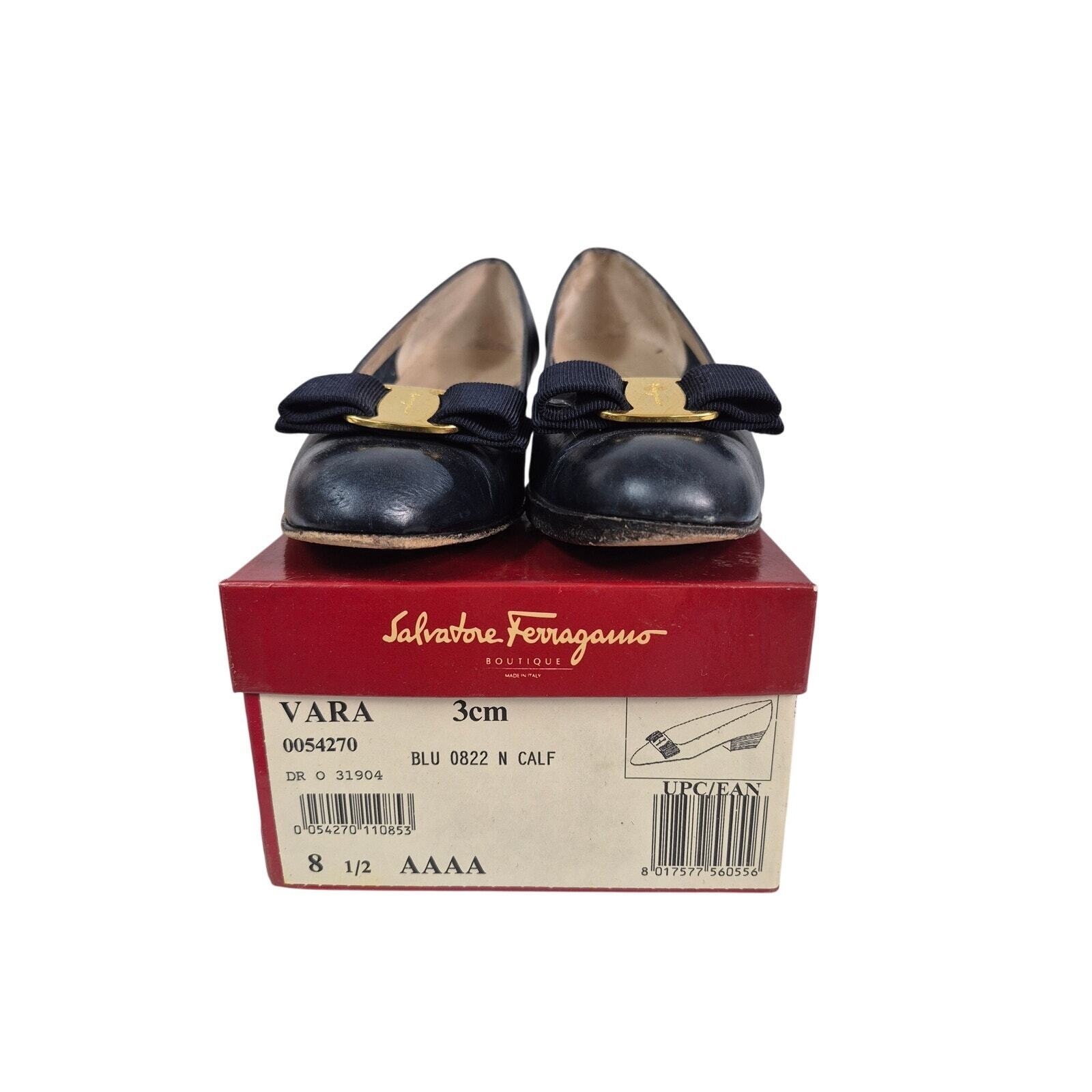 VTG Salvatore Ferragamo Low Heels Shoes Boutique Vara Blue Calf Sz 8.5 AAAA in excellent preowned condition includes the original shoe bag and box.