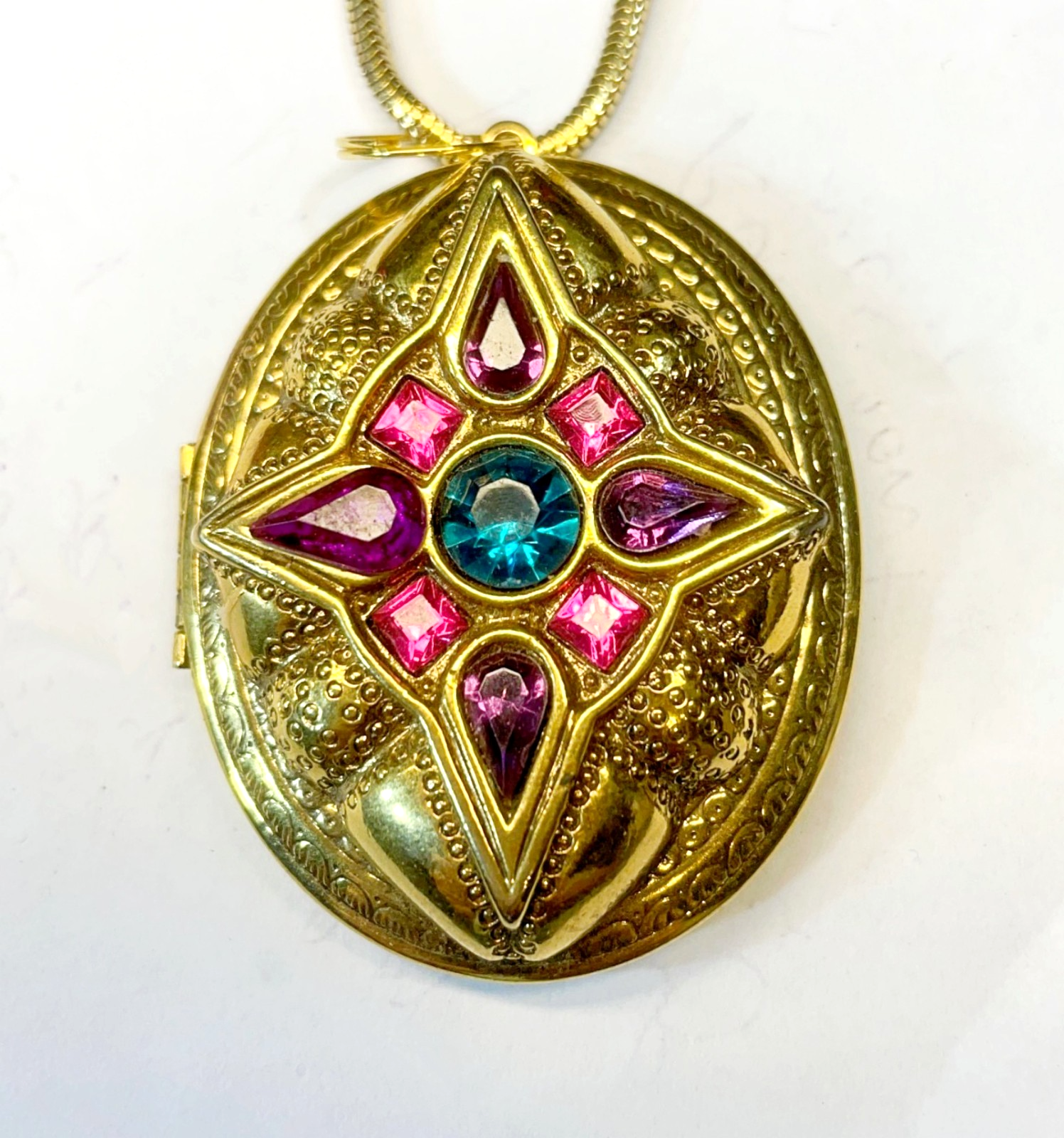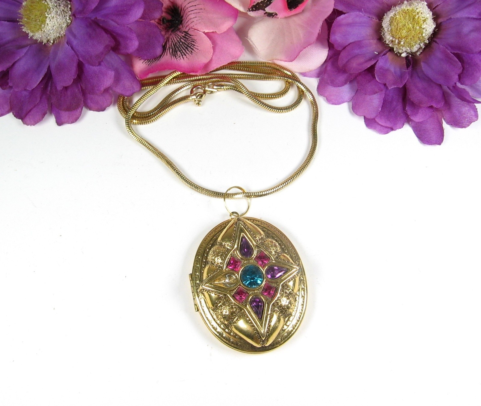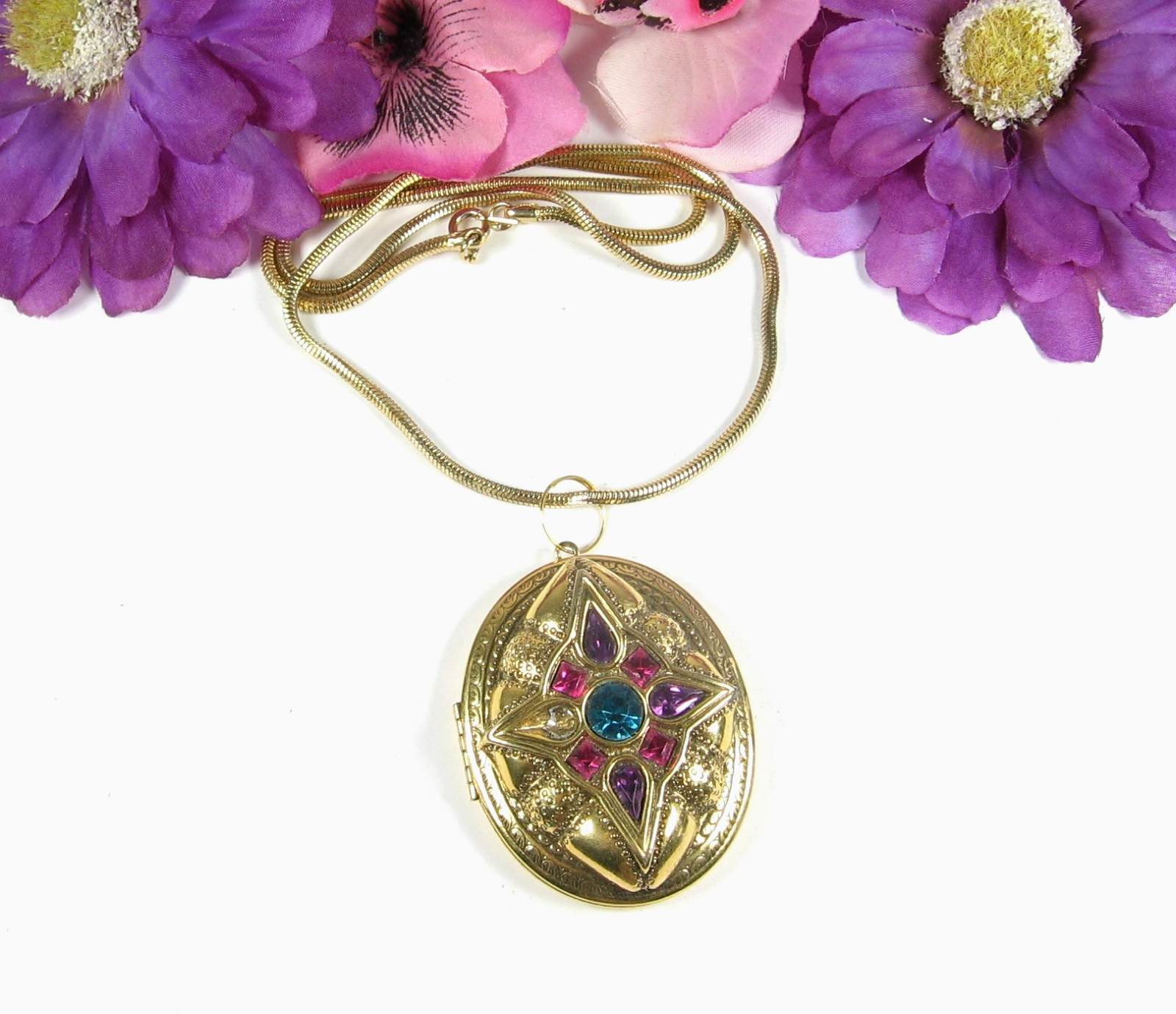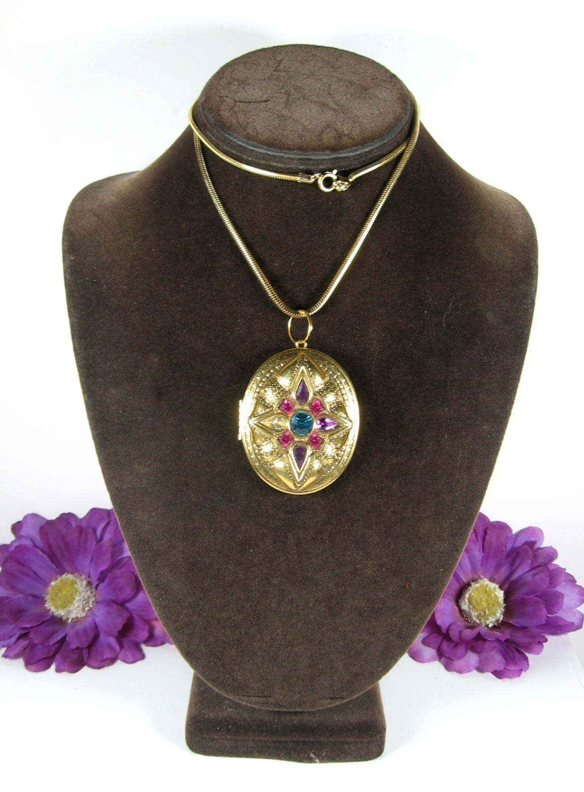 Big 2" RHINESTONE LOCKET Vintage NECKLACE Oval Pendant Purple Pink Goldtone 24"