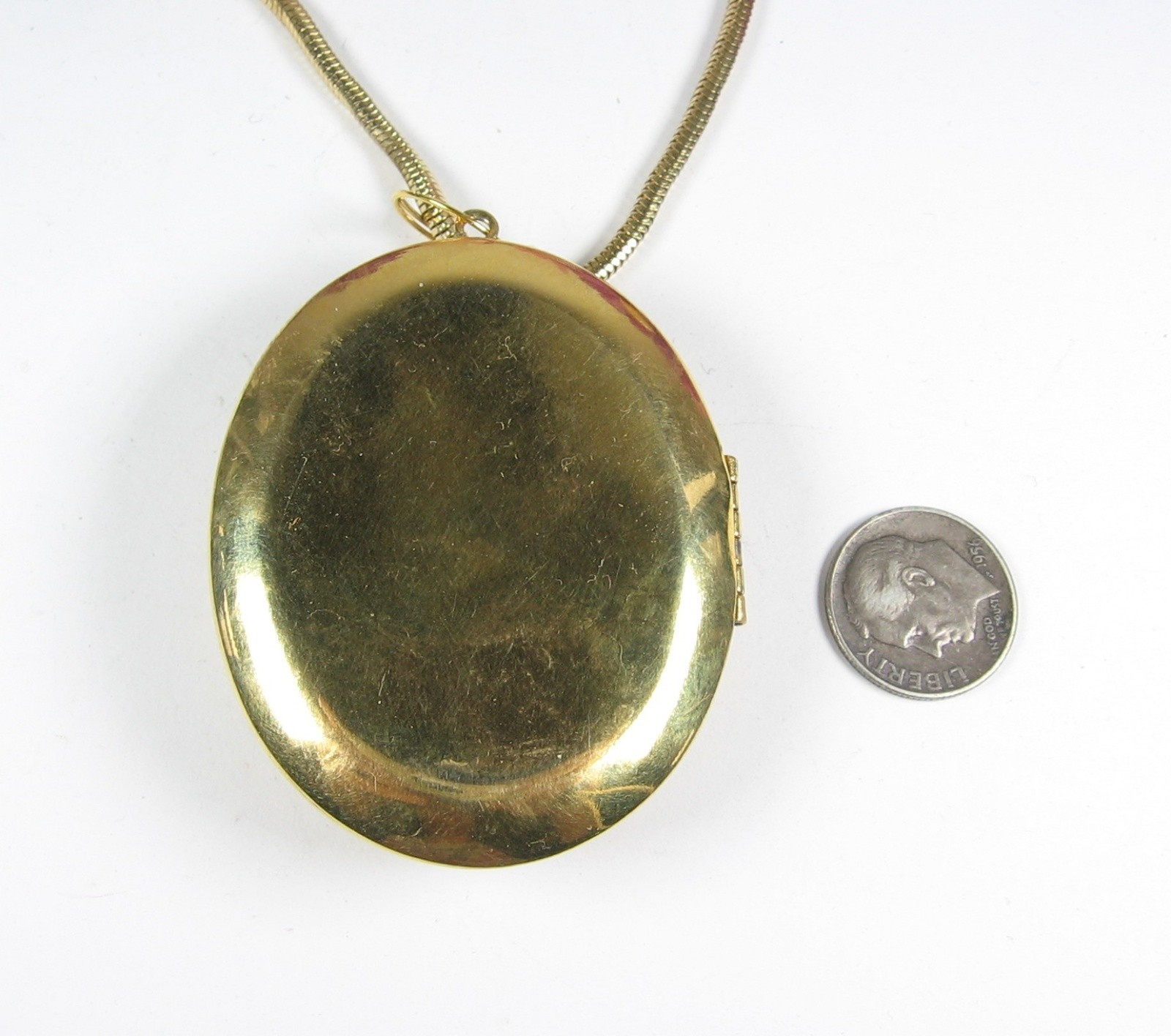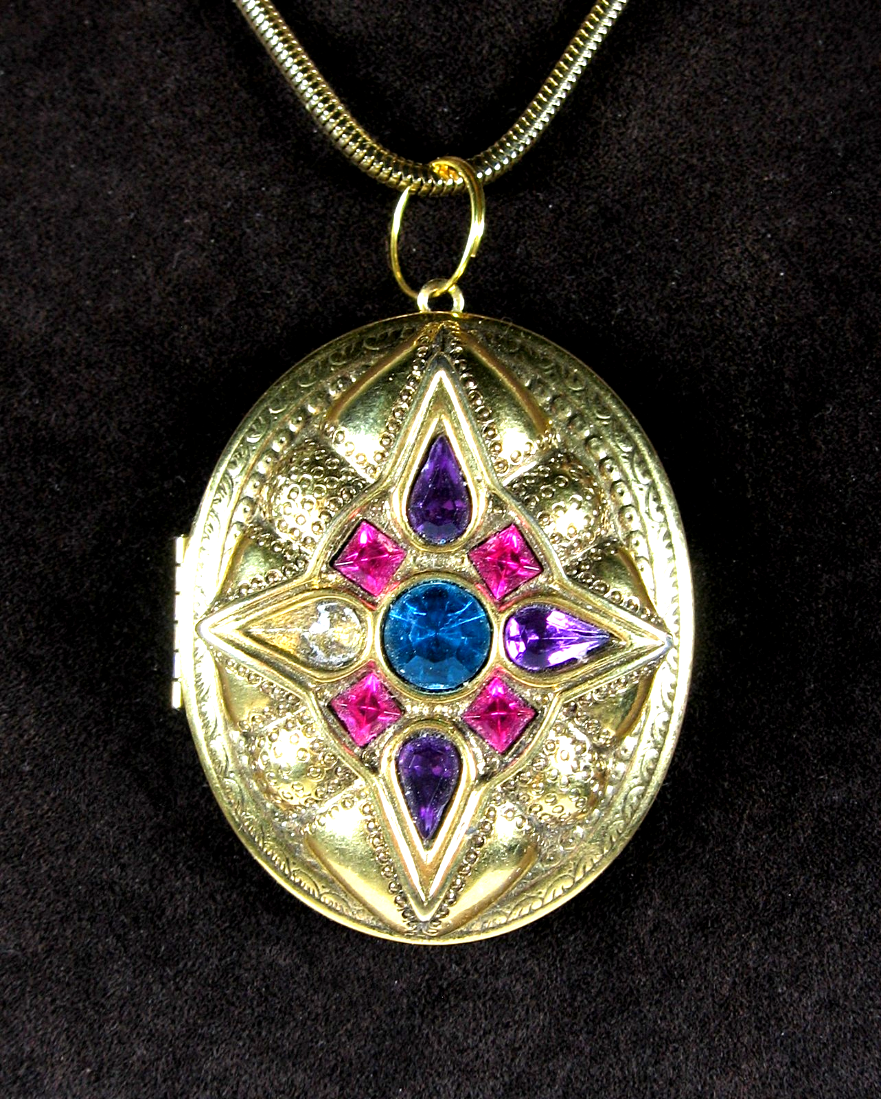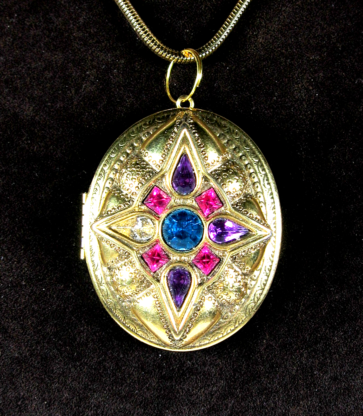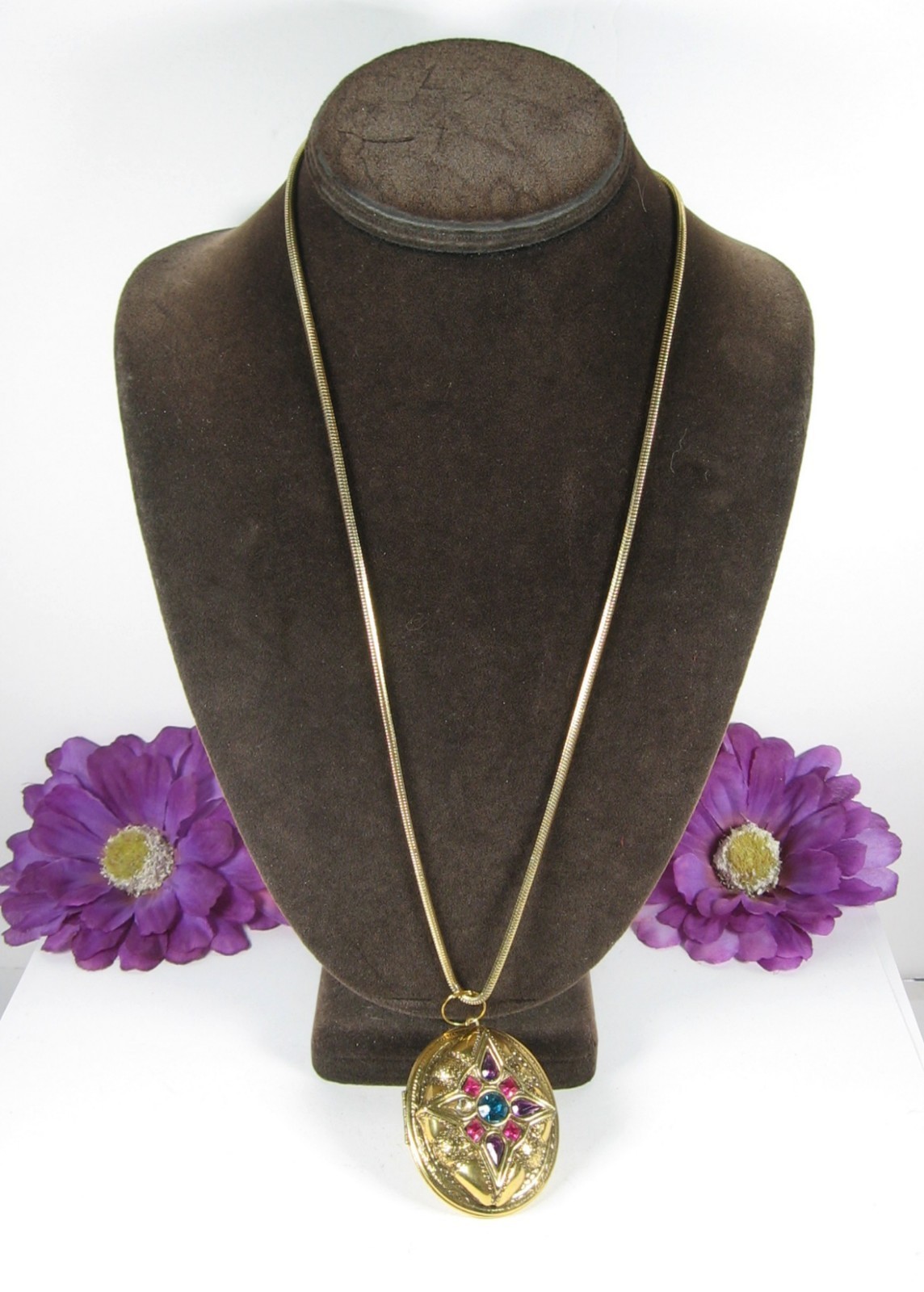 Big 2" RHINESTONE LOCKET Vintage NECKLACE Oval Pendant Purple Pink Goldtone 24"