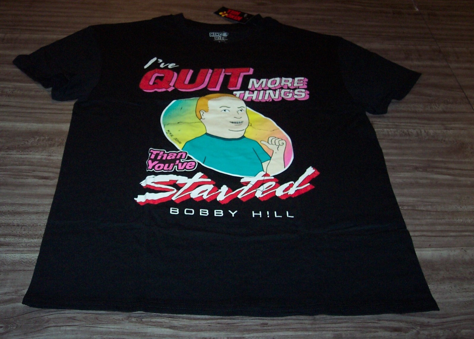 This is a KING OF THE HILL Bobby Hill "I've Quit More Things Then You've Started" T-shirt. It is a size LARGE, and it is NEW w/ TAG. It is 22 inches from armpit to armpit and 30 inches in length. Combine auctions to save on shipping. AD