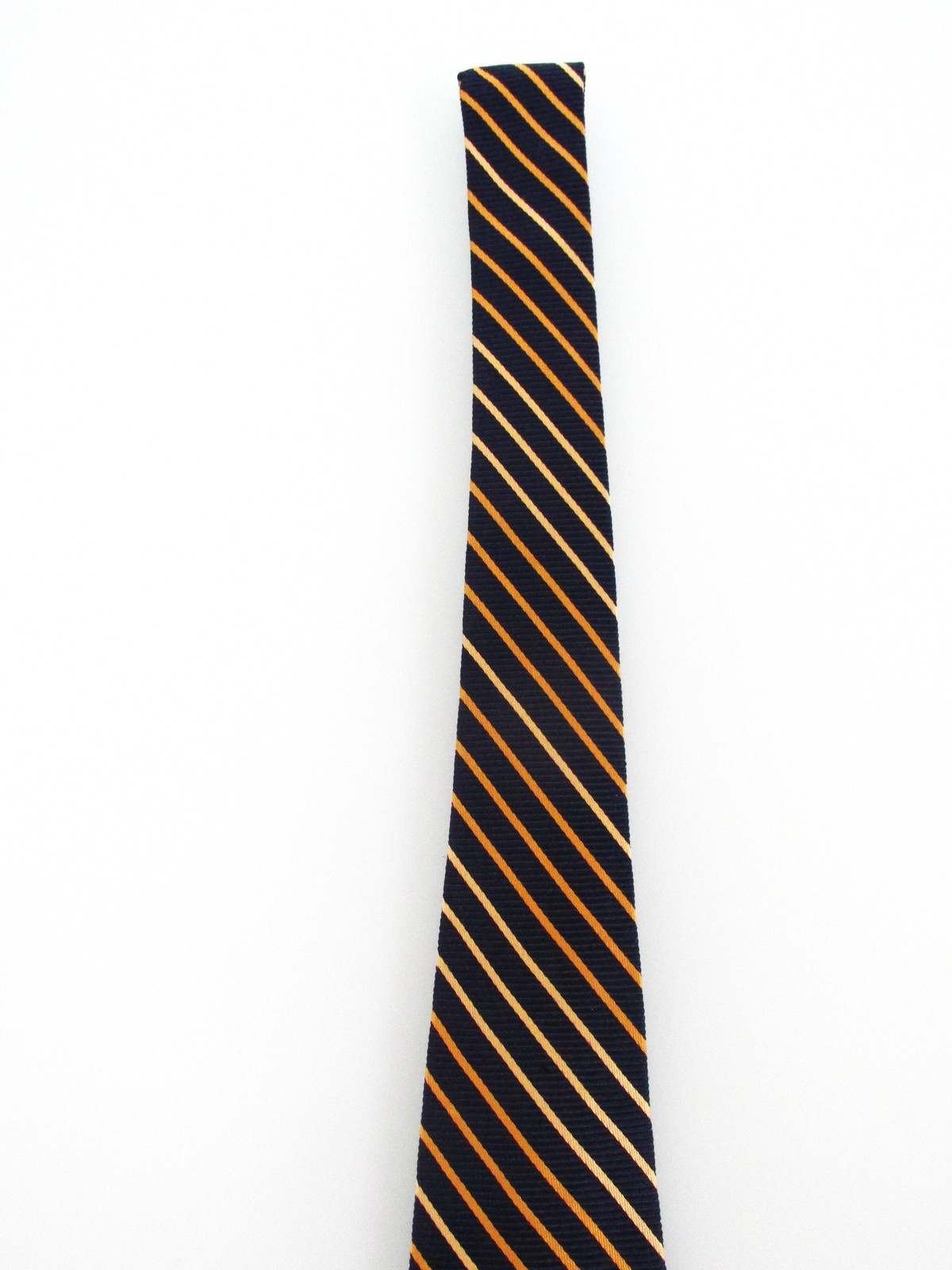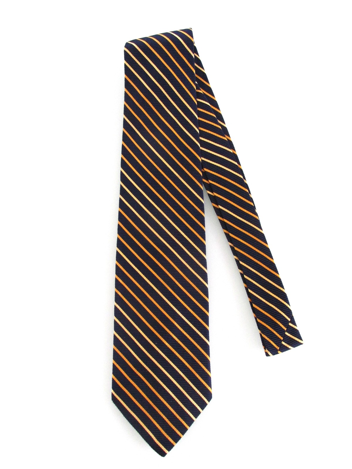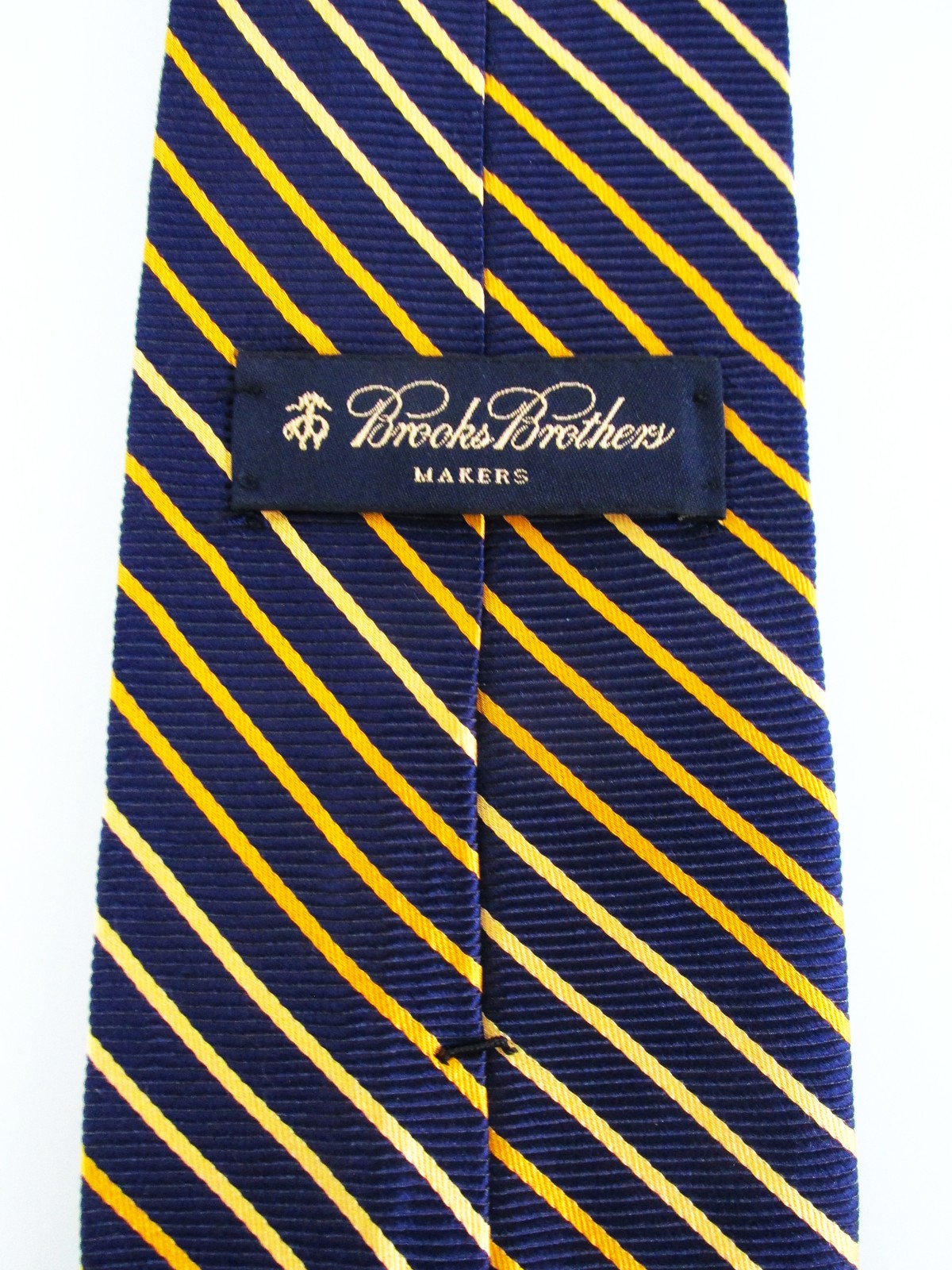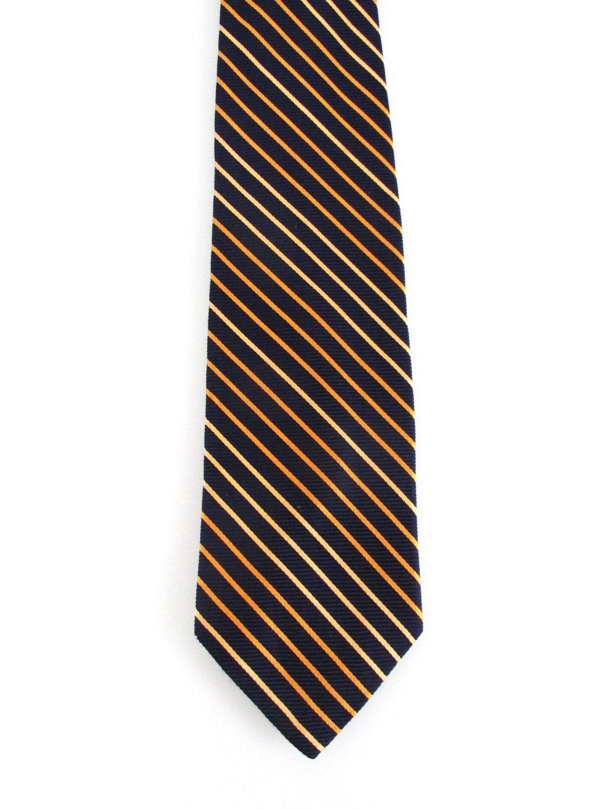 Description: Up for sale is a Brooks Brothers men's silk tie. The tie is handmade in the USA of 100% silk. The tie has a striped pattern in gold yellow on a navy blue background. Dimensions are approximately 59" long x 3 5/8" wide. This tie is in excellent condition.