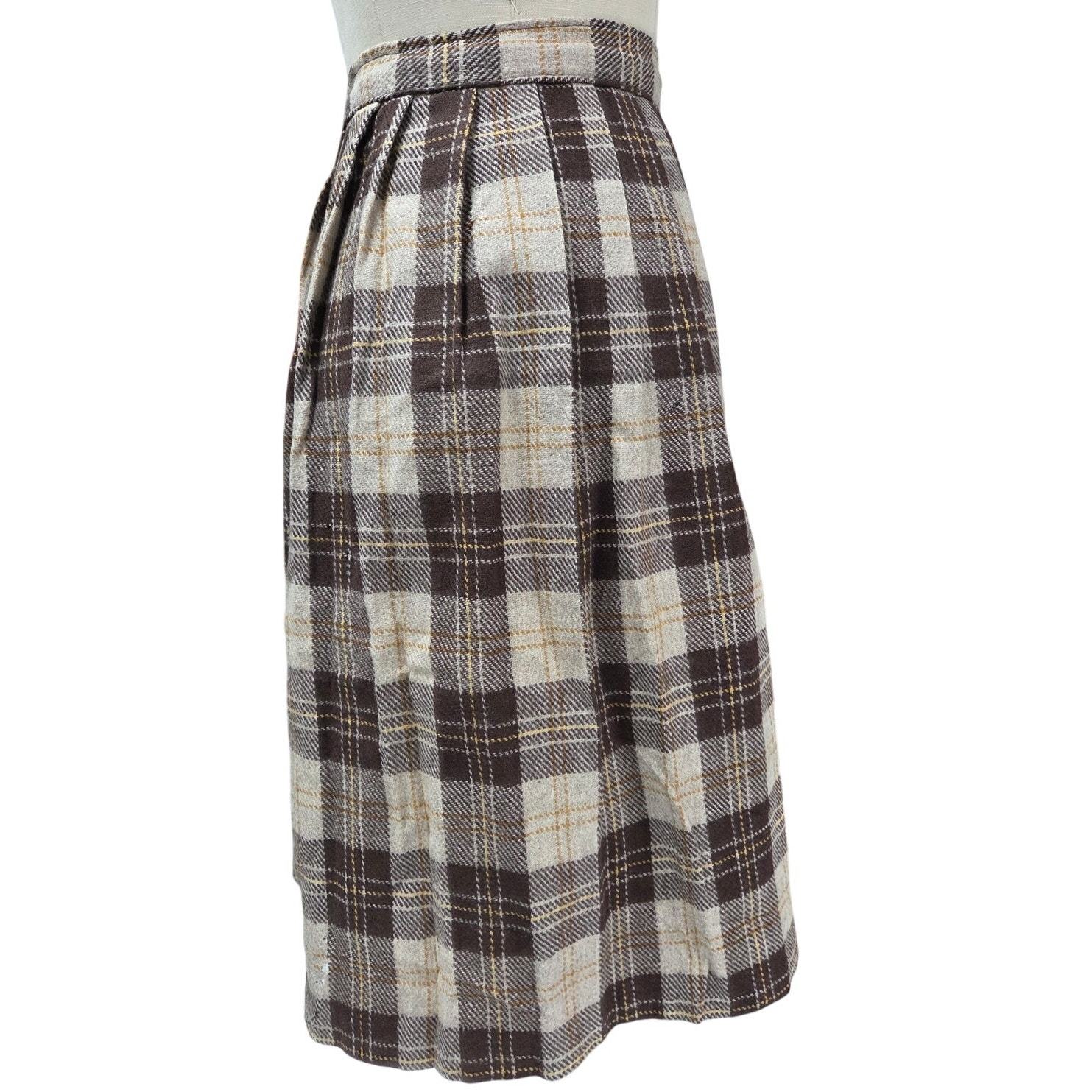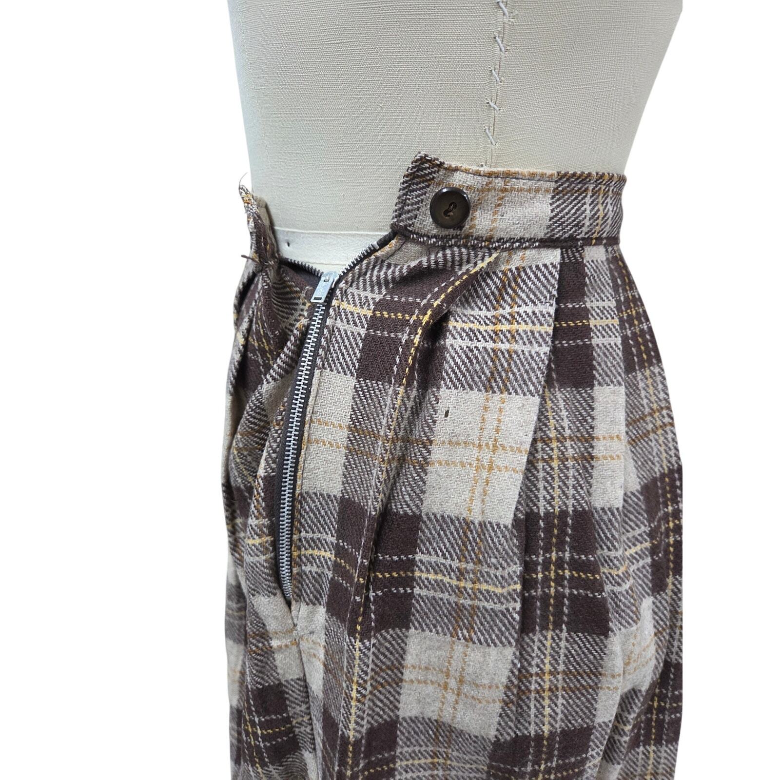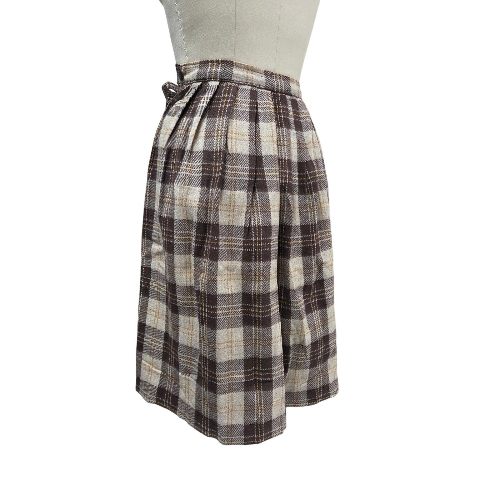 VTG 40s 50s Brown Cream Wool Plaid Pleated Skirt Costume Piece 23.5” XS
