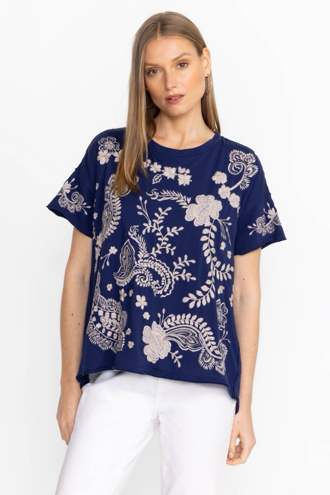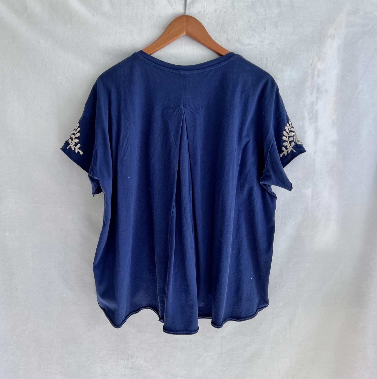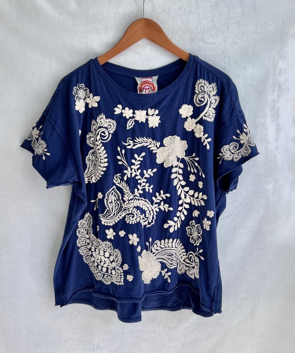 Johnny Was Raw Details Swing Tee T-Shirt Women LARGE Blue Embroidered Cotton Top