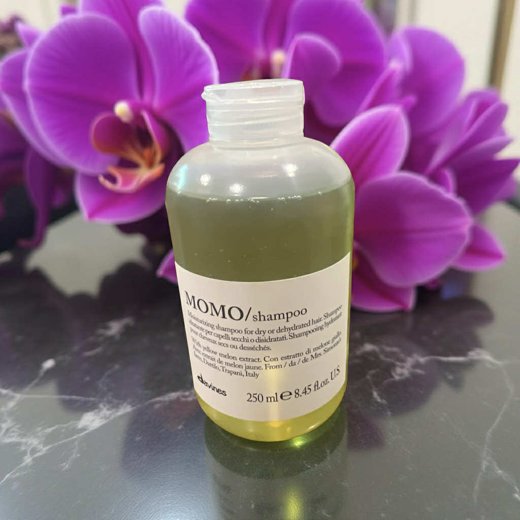 Davines Momo Shampoo 8.45 oz Designed to gently cleanse dehydrated hair, giving it a strong boost of hydration. Light shampoo with gel texture, characterised by a creamy foam. Hydrated, soft, shiny and renewed hair. Natural active ingredients.