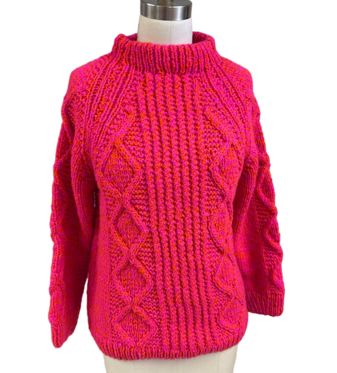 Fabric / Materials: 100% hand-knit wool, neon pink + orange.