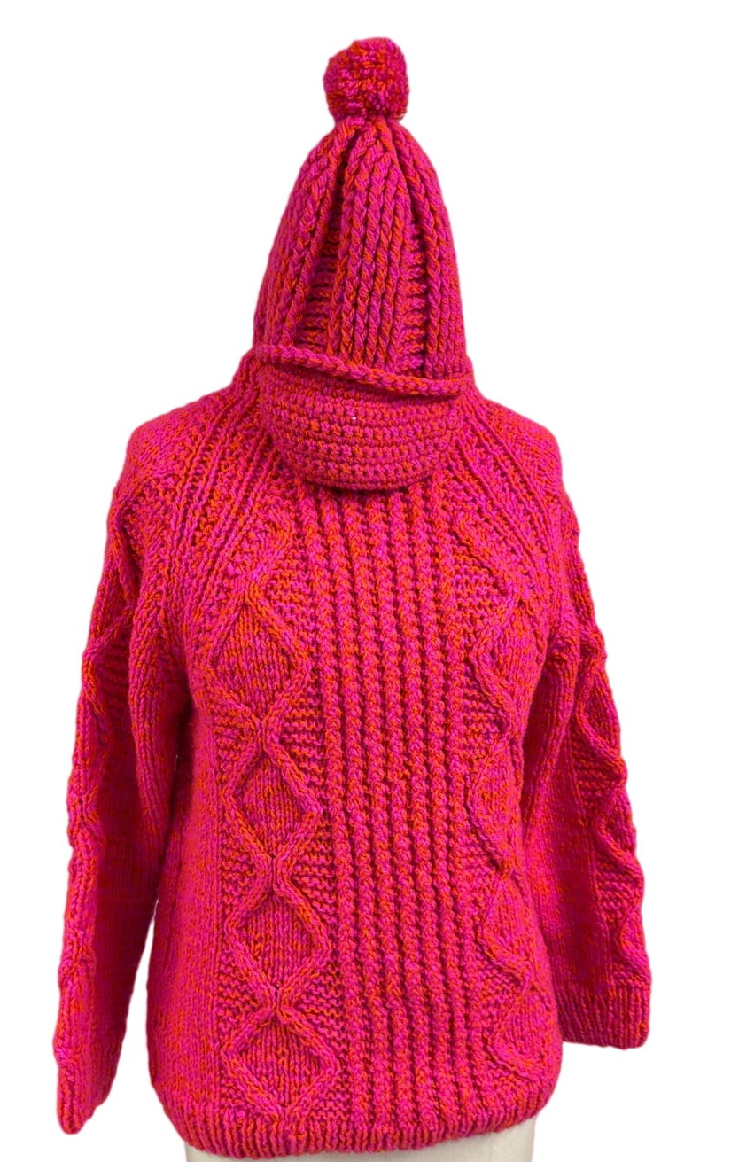 VTG 60s Womens Ski Lodge Handknit Wool Sweater Hat Set Neon Pink Orange L