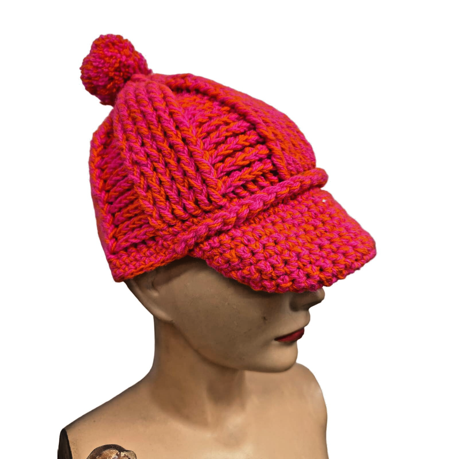 Vintage 1960s women?s ski lodge hand-knit sweater and matching newsboy cap, crafted in wool in vibrant neon pink and orange tones. The sweater features a cozy, chunky hand-knit design and ribbed stretch hemline. The matching knit cap (newsboy style with visor) completes the look, making this a rare and fun original set. Note that model photo may not show the true orange and pink colors.
