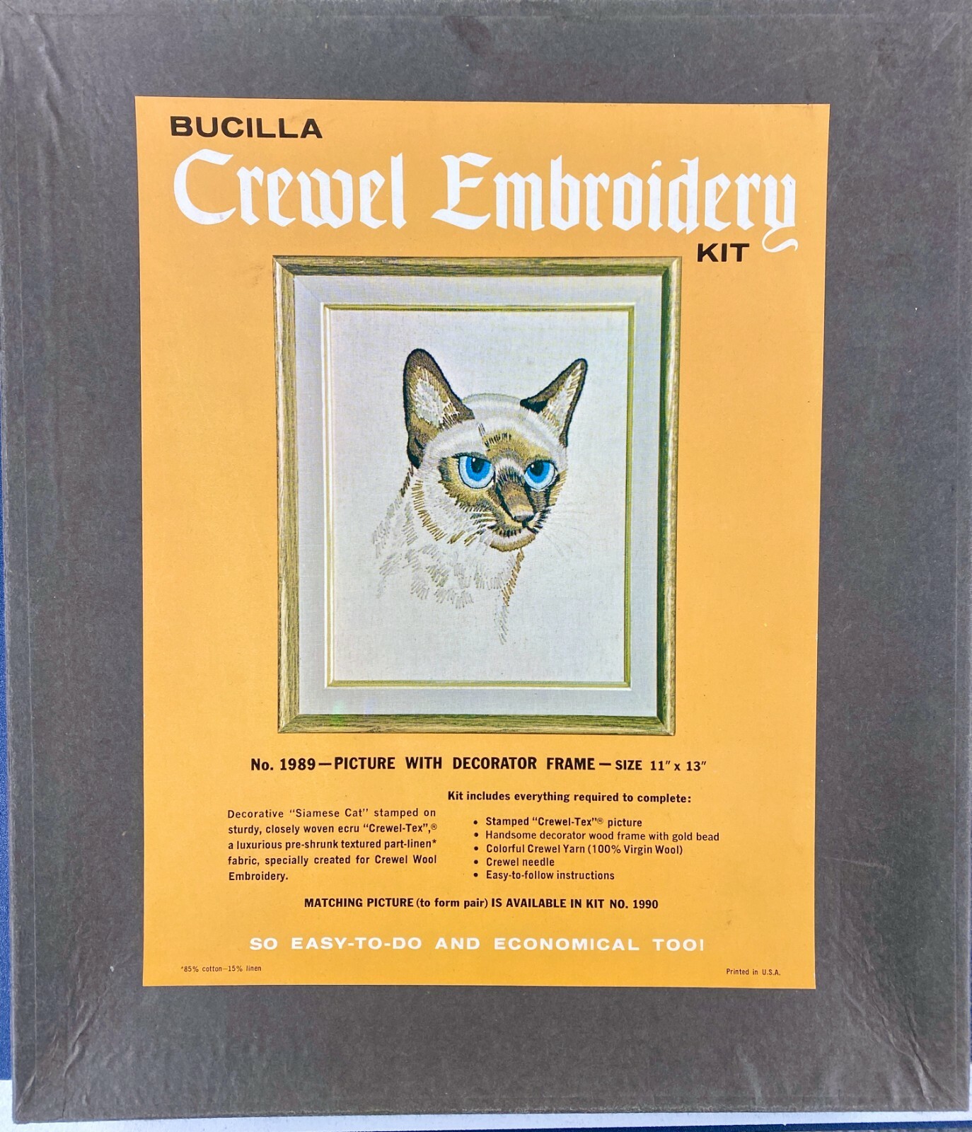 Vintage RETRO Bucilla Crewel Kit #1989 Siamese Cat Kitty Box 11 x 13 Frame Inc.