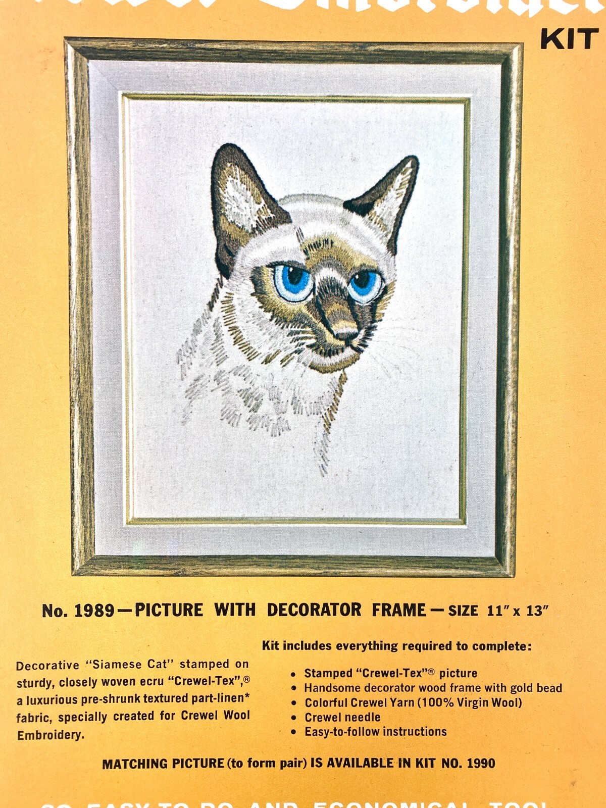 Vintage Bucilla Crewel Kit #1989 Siamese Cat Kitty Box Frame Included.