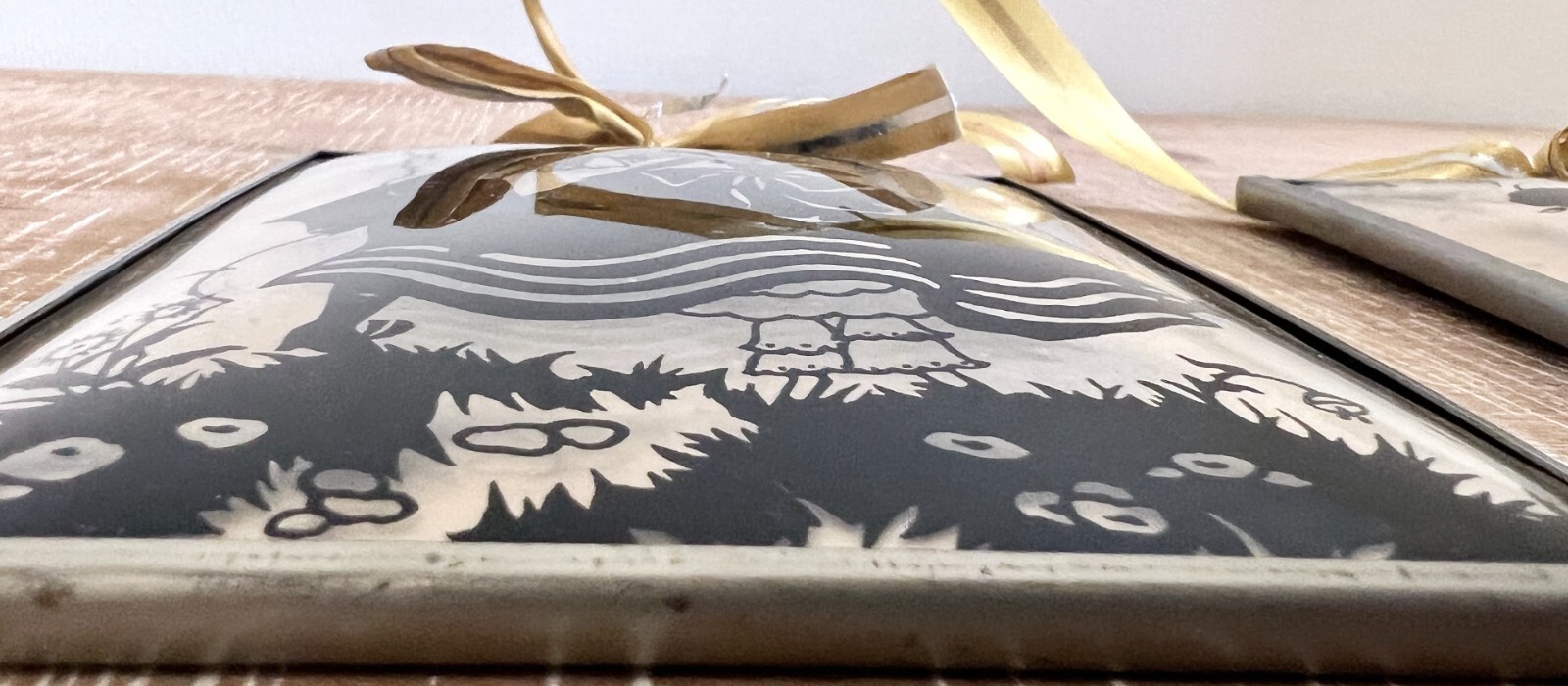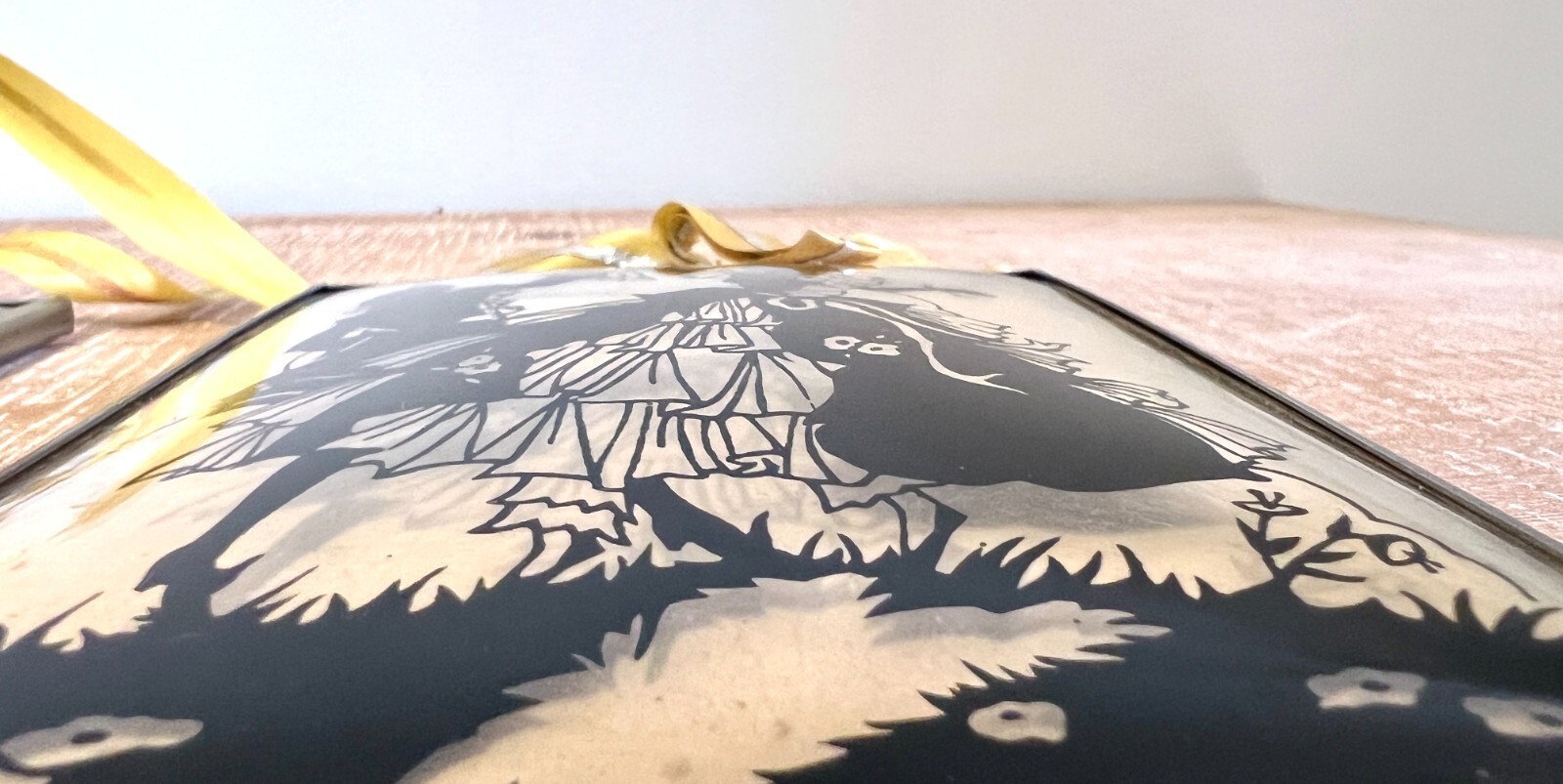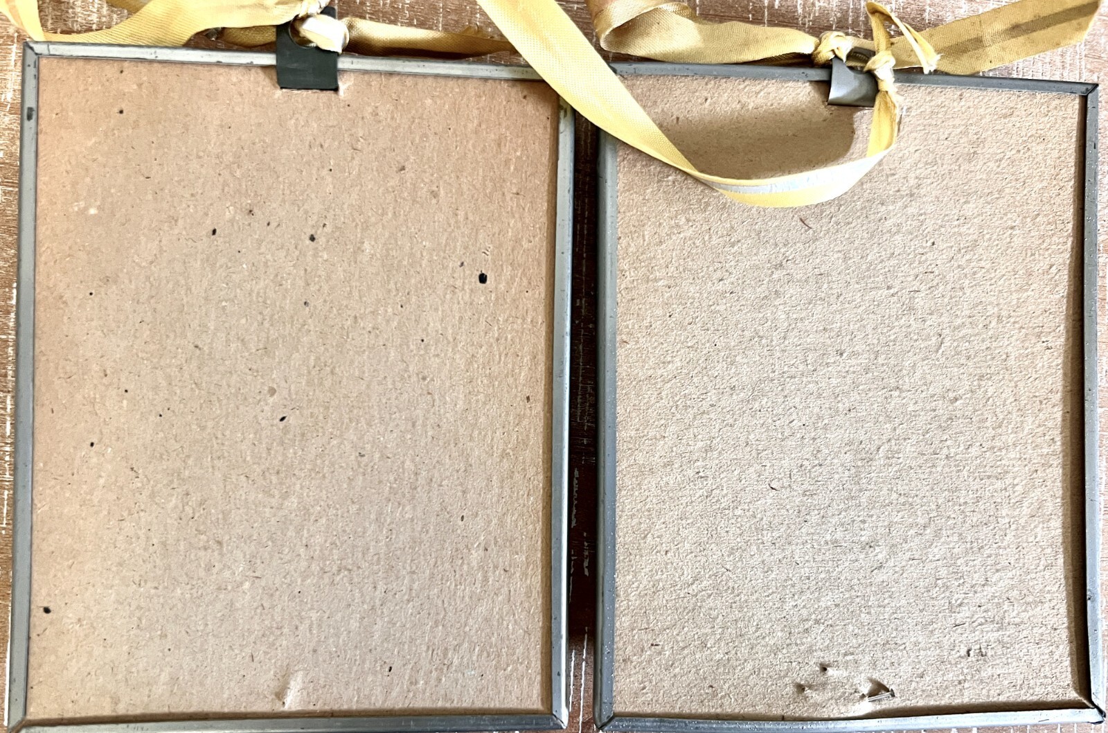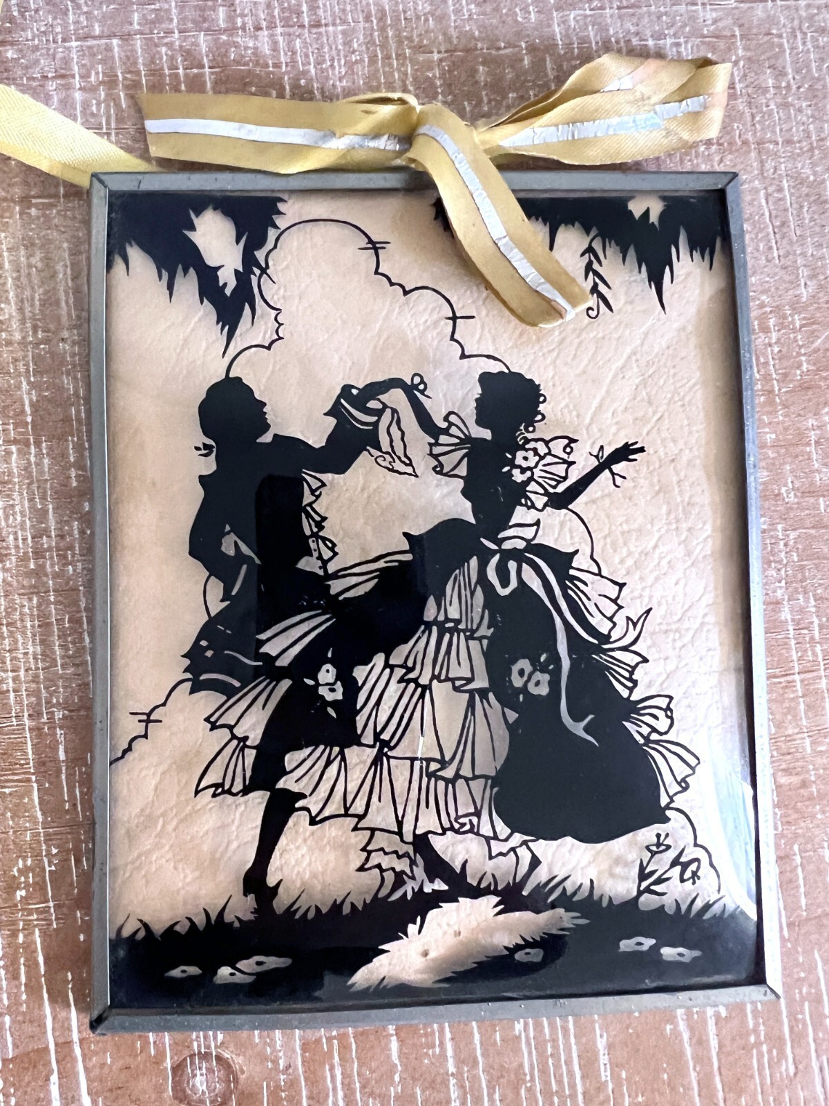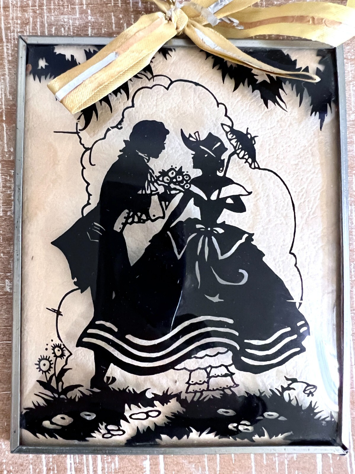 Pretty vintage silhouettes under concave glass measure 5" x 4", perfect condition. They are attached by a yellow ribbon, but it can be removed.