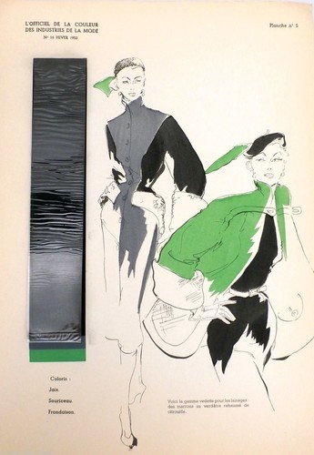 Vintage L'?Officiel de la Couleur French fashion design catalog page is rare and hand painted ( see below) and has a piece of attached ( though can be lifted) cellophane over colored paper intended to show the color choices of the material.These are extremely rare and would be beautiful framed in groups. Fab swing coat and New Look Suit in black and green.