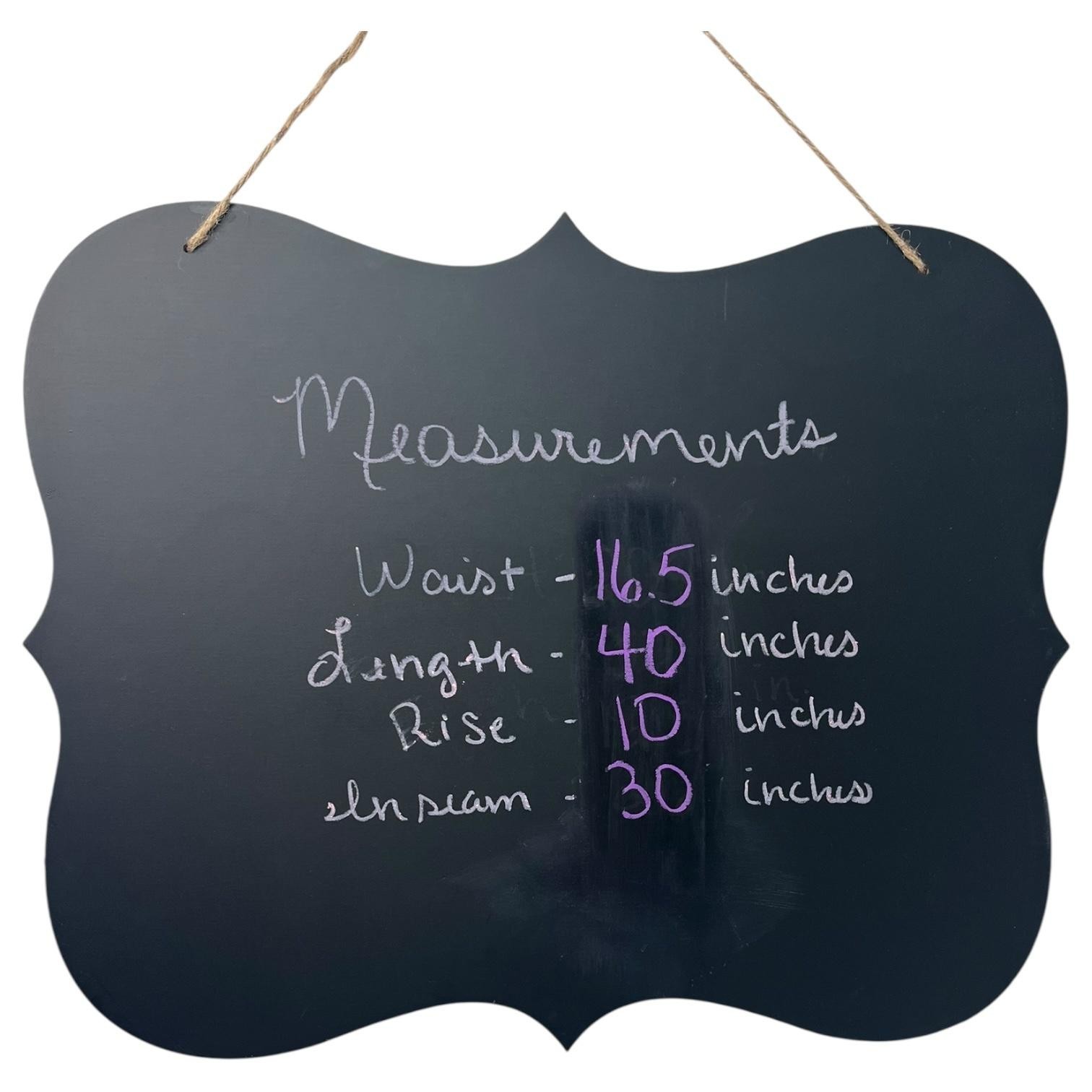 Measured from photos: Waist 16.5 inches (approx. 33"), Rise 10 inches, Inseam 30 inches, Length 40 inches