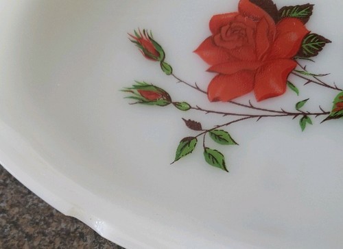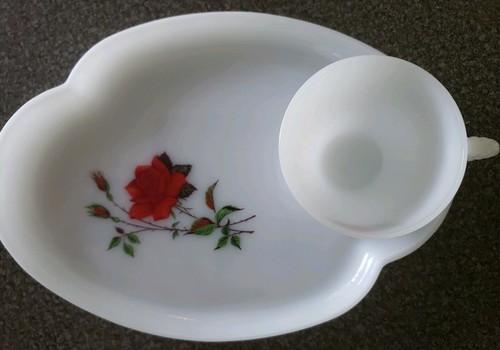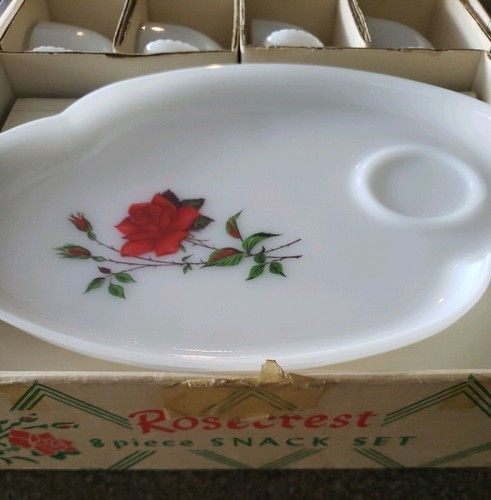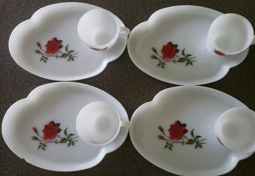 Vintage Federal Glass Rosecrest 8 PC Luncheon Snack Tea Set Red Rose Cup Plates