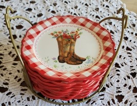 9-Piece Set ~ Pioneer Woman ~ 7" COWGIRL BOOT Stoneware Plates ~ Gold-Tone Rack