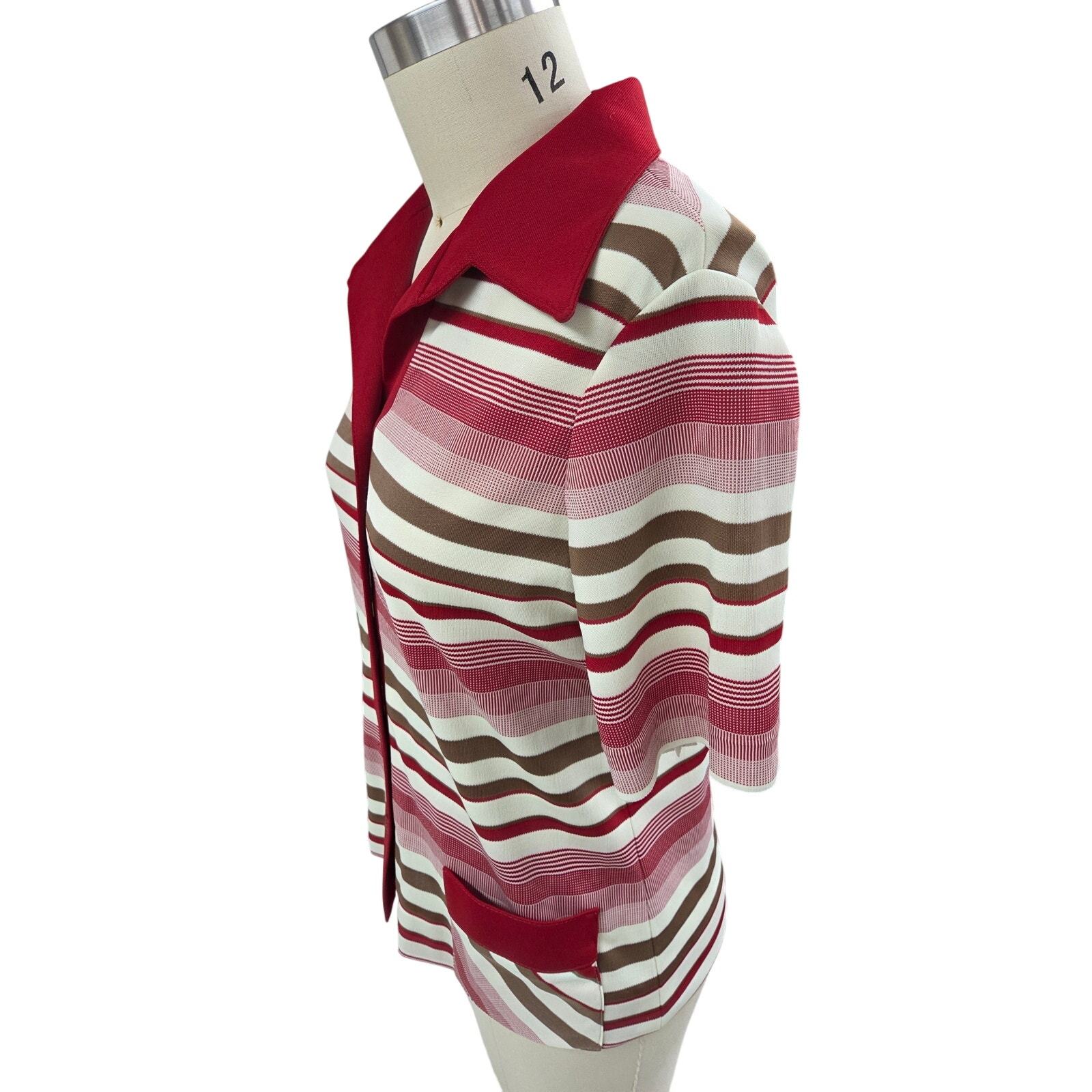 What you?ll love about this piece is its bold retro energy ? a 1970s striped button-down in red, brown, and white polyester knit with a dramatic disco collar and classic patch pockets. Lightweight and sharply tailored, it?s a perfect statement piece that channels the era?s iconic cool.