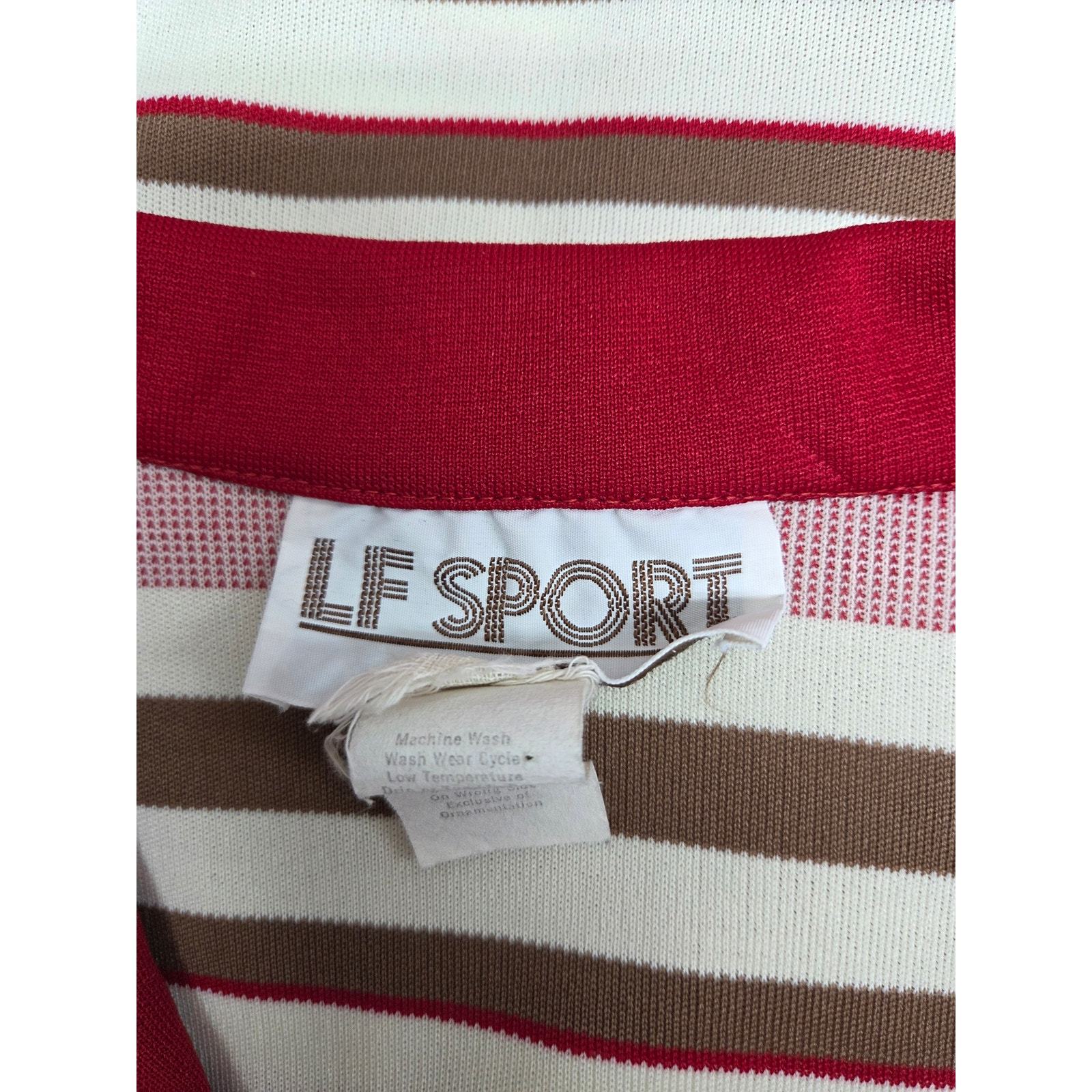 Made by LF Sport, a mid-to-late 1970s label known for casual women?s and unisex sportswear. The bold collar and clean stripe pattern are quintessential disco-era design hallmarks.