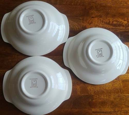 Bowls measure approximately 6.5" diameter x (7.5" wide including handles) x 1.75" tall