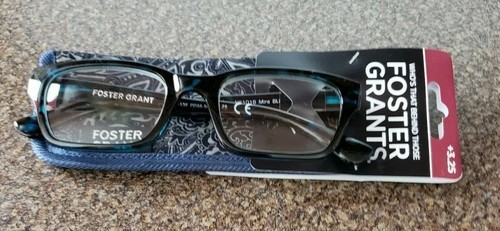 FOSTER GRANT MIRA BLUE FRAME READING GLASSES W/CLOTH CASE NS1016, +3.25 NEW