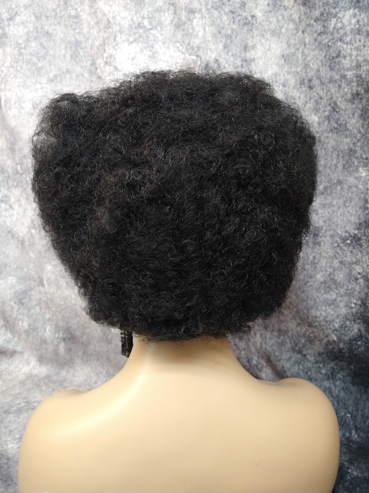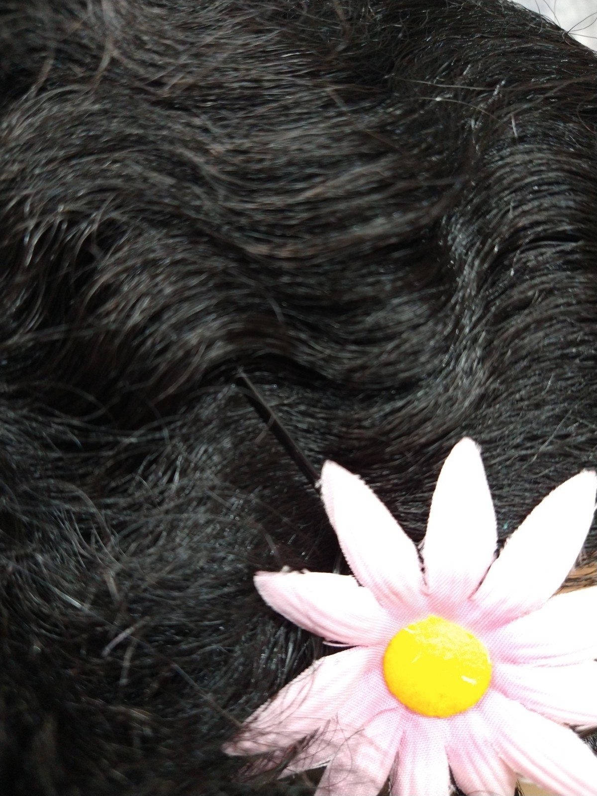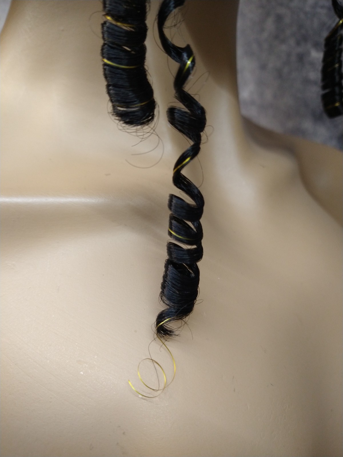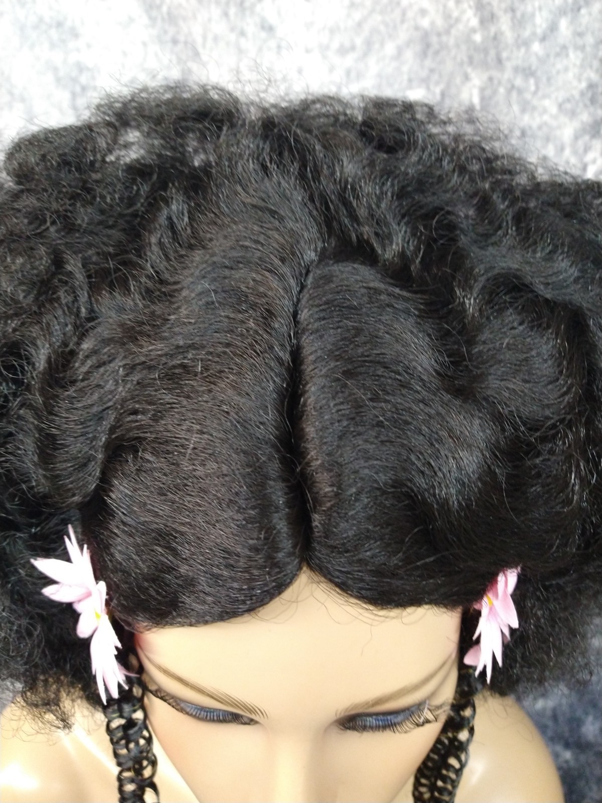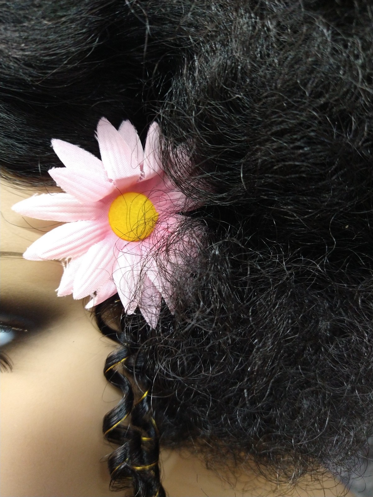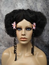Super Frizzy Afro Style Wig. Wig is Black with Pink Daisy Flowers and tendril curls on the sides. Some of the tendril curls have a bit of stretch in them. Fiber is wild and extremely frizzy. This wig is not extremely thick but the fiber can be teased out more if you want a bigger look. Parted in the center with hair pins on the sides. This is a new but older item. The date on the bottom shows 1997. It will be necessary to adjust the fiber to conceal cap and or mesh. Expect shedding of loose fiber. Picks up lint easily. DOES NOT INCLUDE MANNEQUIN. This listing is for the same wig as in the photos.