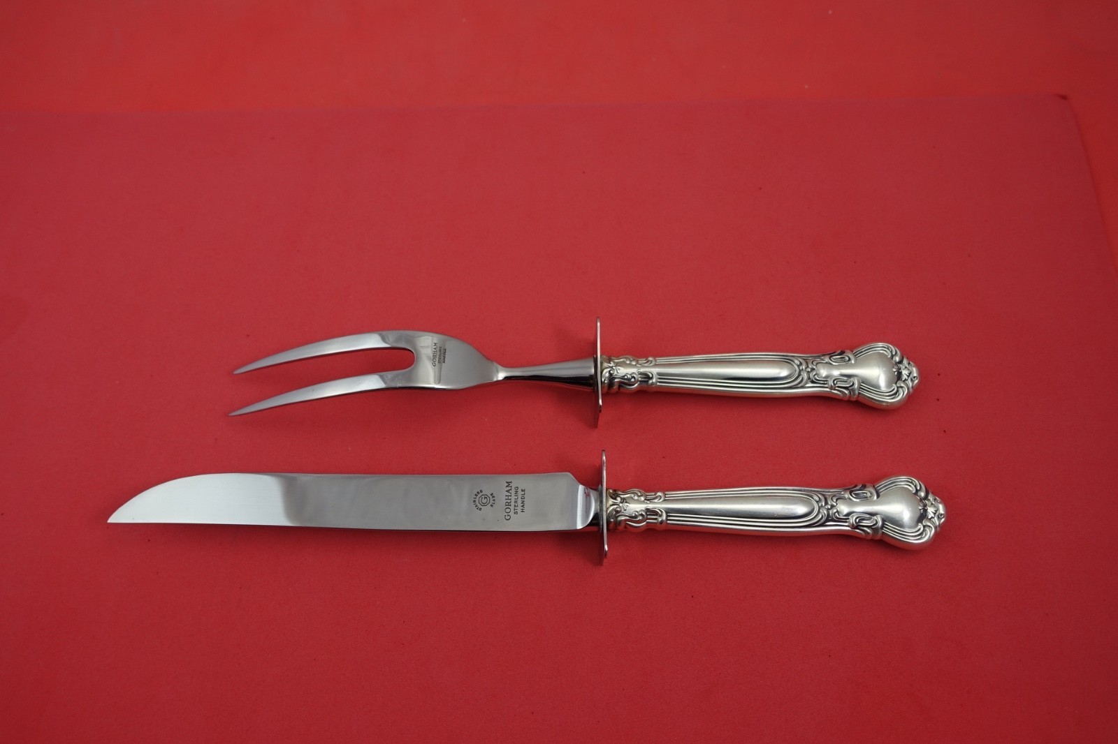 Sterling silver hollow handle with stainless implement, Game Carving Set, knife 10 3/4" and fork 9 1/2" in the pattern Chantilly by Gorham. It is not monogrammed and is in excellent condition.