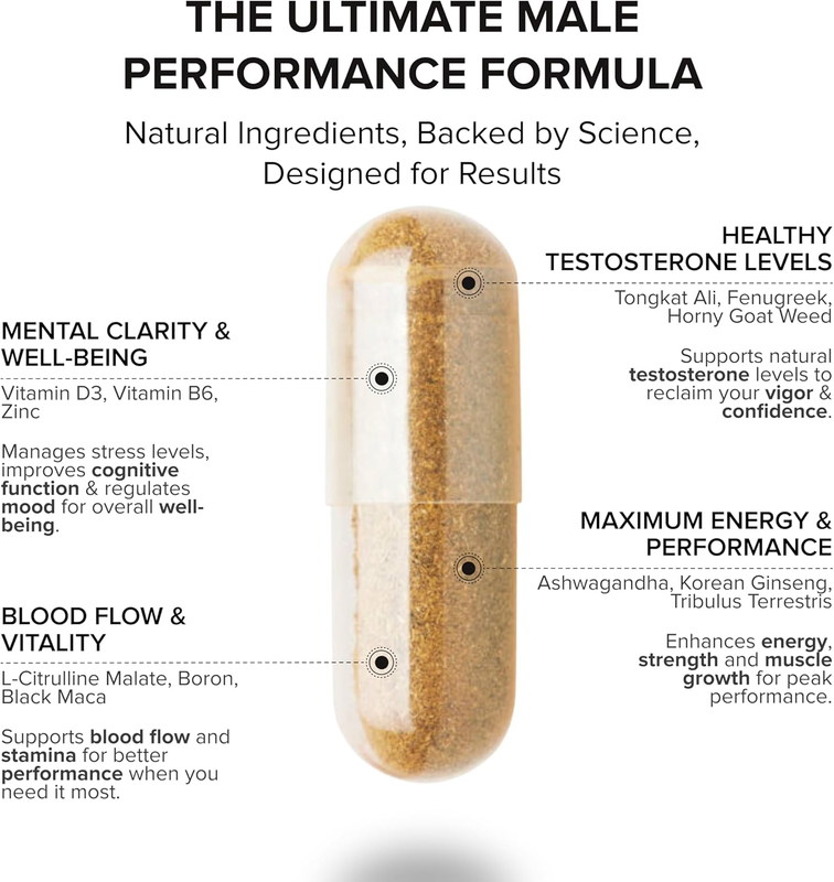 Boosts free total testosterone with essential nutrients like Zinc, Boron, Vita D3, and B6*
