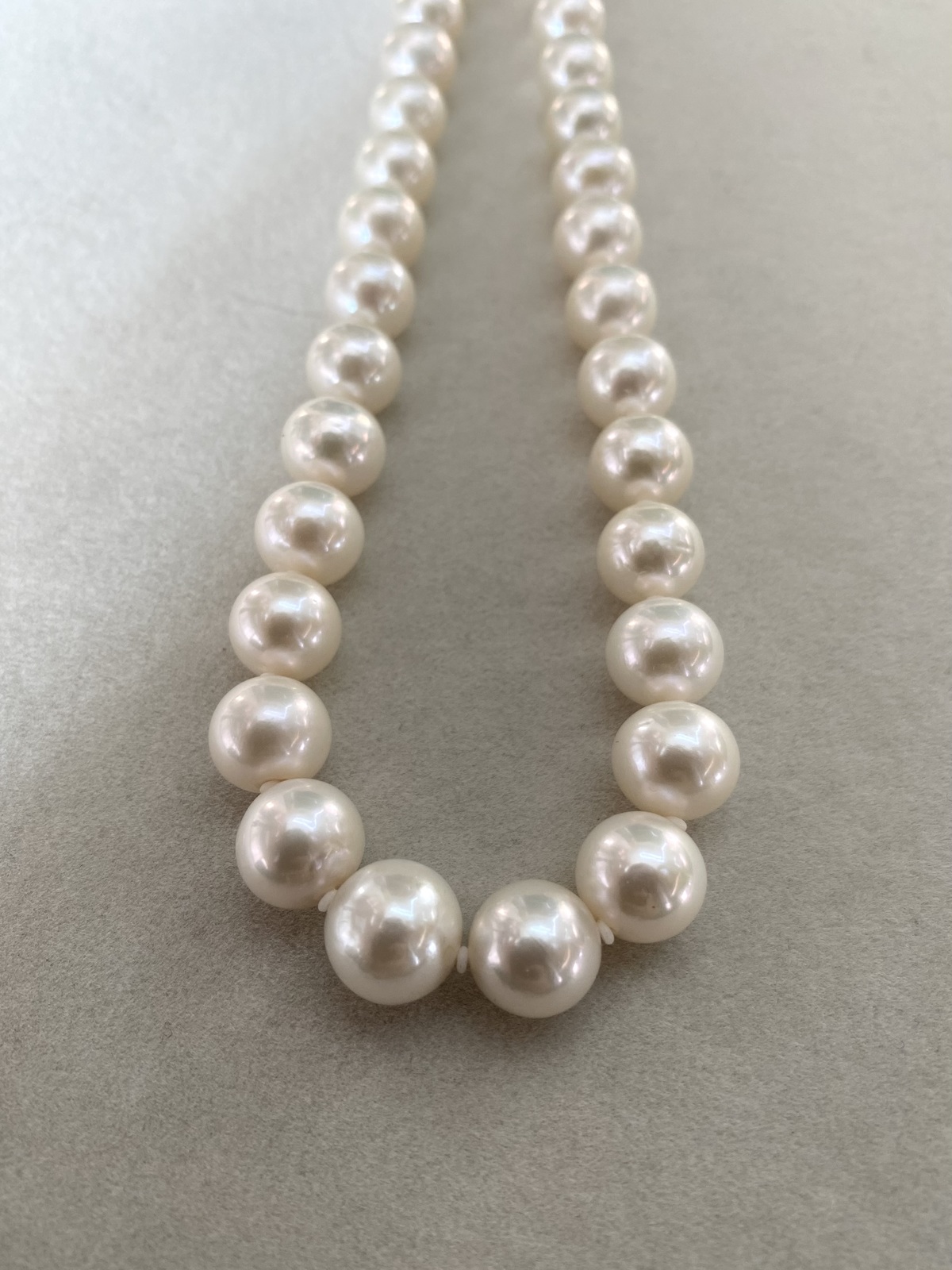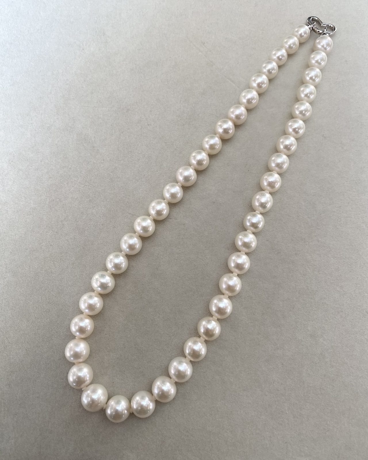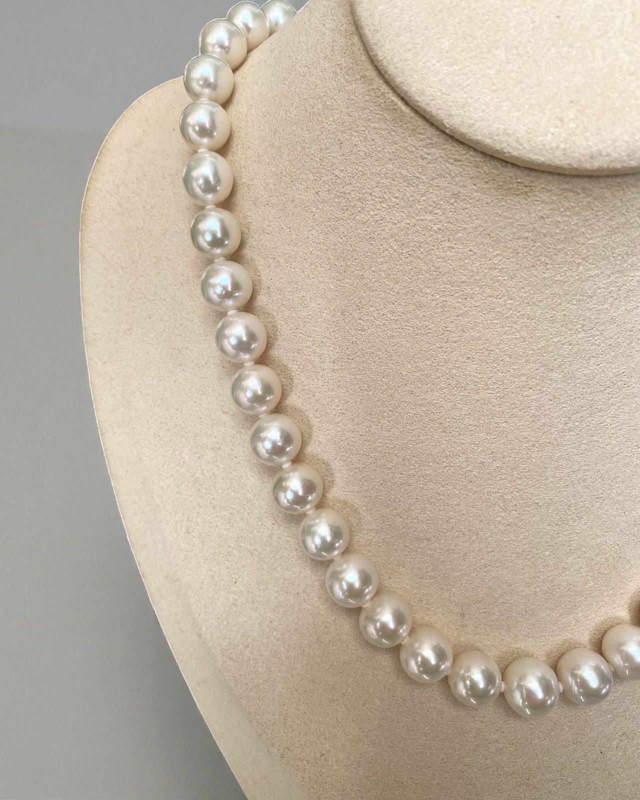 The pearls along the strand are exceptionally clean, with only a few displaying the fine natural texture characteristic of authentic cultured pearls. They are securely strung on a professional pearl cord, with discreet spacers between each pearl to prevent friction—ensuring both durability and an enhanced sense of visual flow throughout the necklace. The result is a piece that feels balanced and poised—refined without ostentation, carrying both simplicity and quiet sophistication.