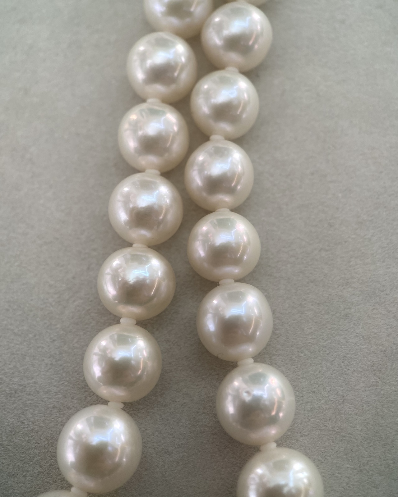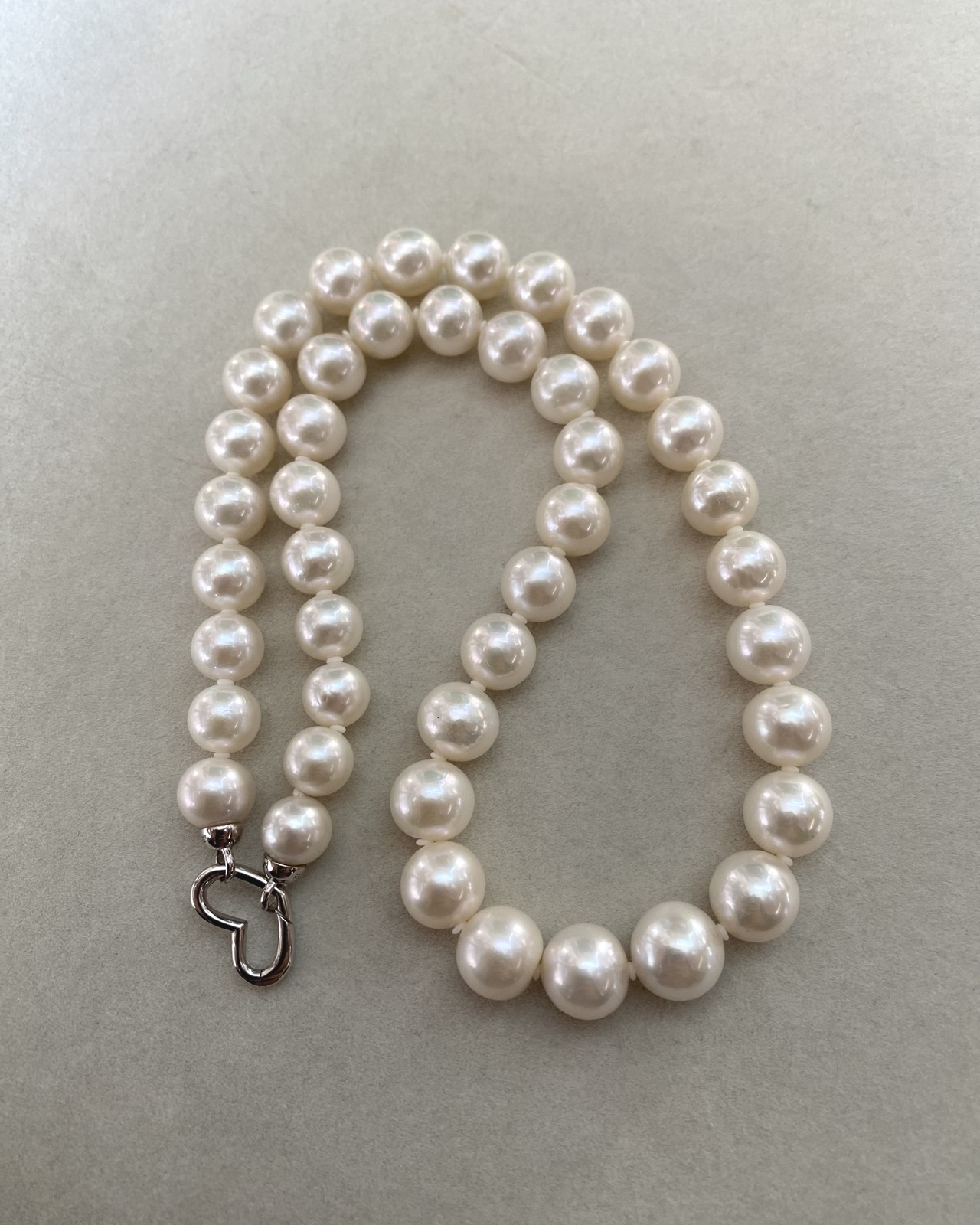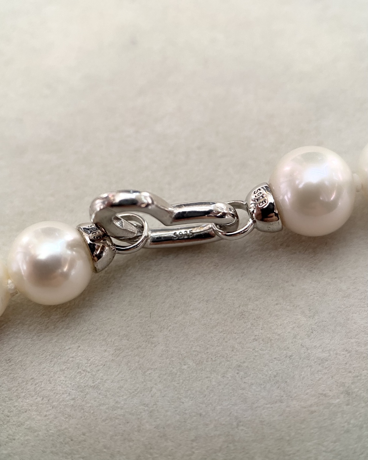 The pearls along the strand are exceptionally clean, with only a few displaying the fine natural texture characteristic of authentic cultured pearls. They are securely strung on a professional pearl cord, with discreet spacers between each pearl to prevent friction—ensuring both durability and an enhanced sense of visual flow throughout the necklace. The result is a piece that feels balanced and poised—refined without ostentation, carrying both simplicity and quiet sophistication.