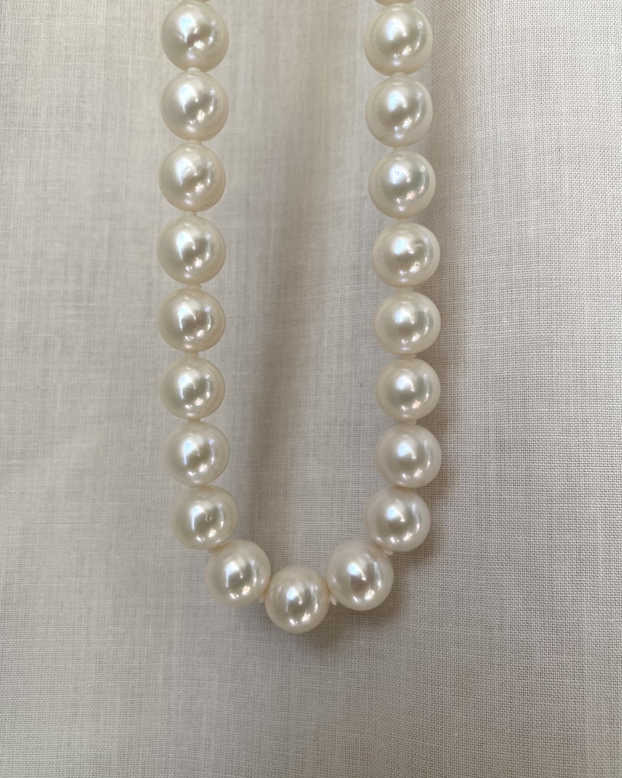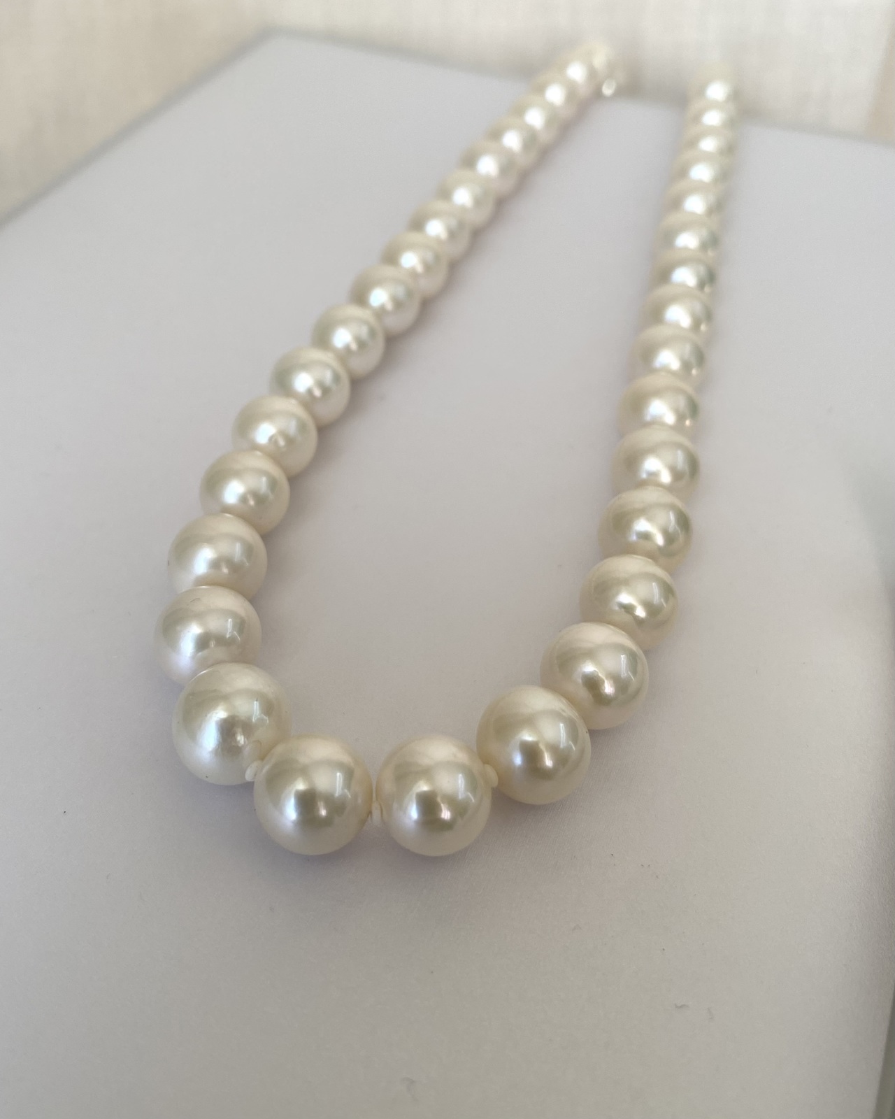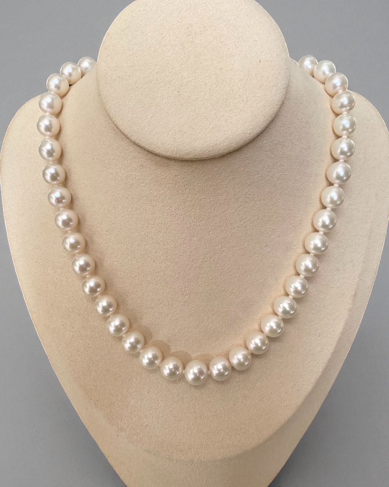 This elegant strand is composed of beautifully matched radiant white pearls, displaying a refined balance between size, lustre, and proportion. It features a total of 43 pearls—27 measuring approximately 9–10mm, and 12 slightly larger pearls ranging from 10–11mm. The arrangement follows a gentle graduation, transitioning seamlessly from smaller pearls near the clasp to the fuller, more substantial ones at the centre, creating a sense of natural symmetry and graceful flow along the neckline.