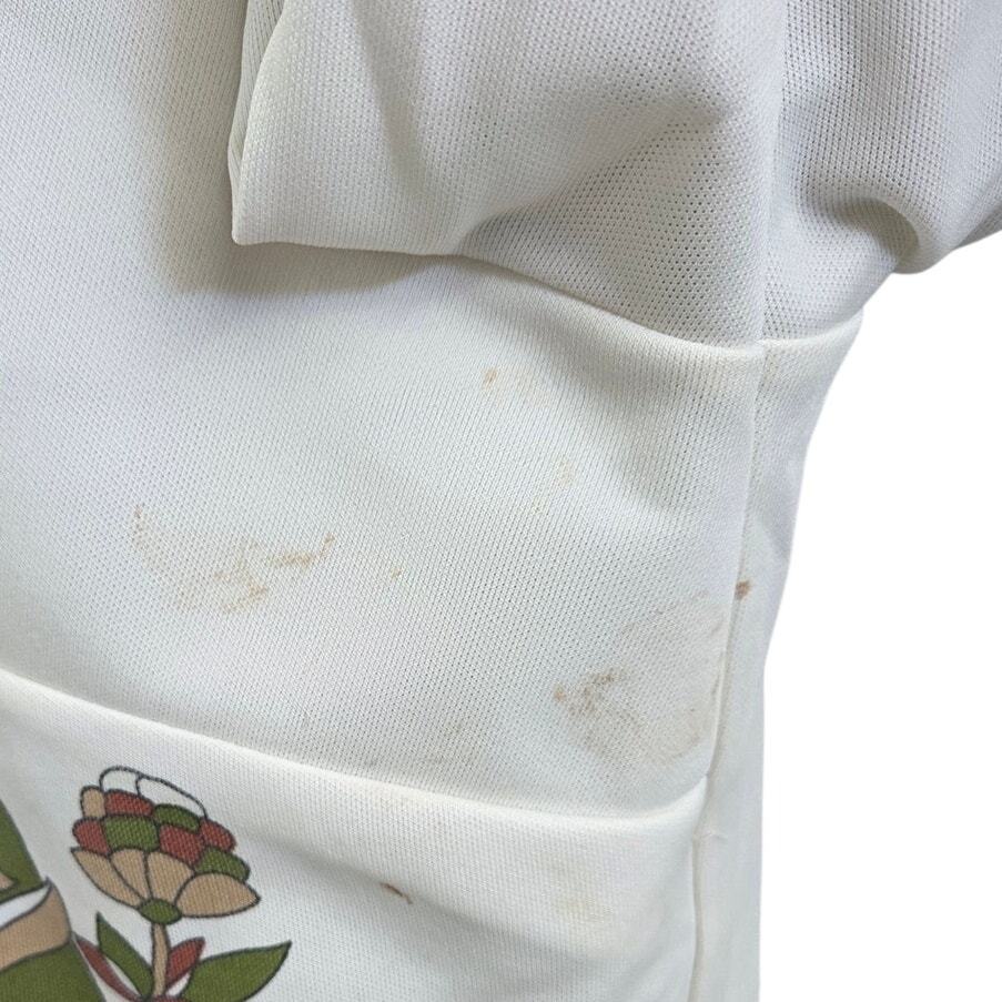 This 1970s floral border print blouse embodies the romantic boho energy of the decade ? featuring a lush green vine and floral motif on soft polyester knit. Lightweight and drapey with a bold border hem and classic pointed collar, it?s perfect for styling, costuming, or reworking into a modern statement piece.