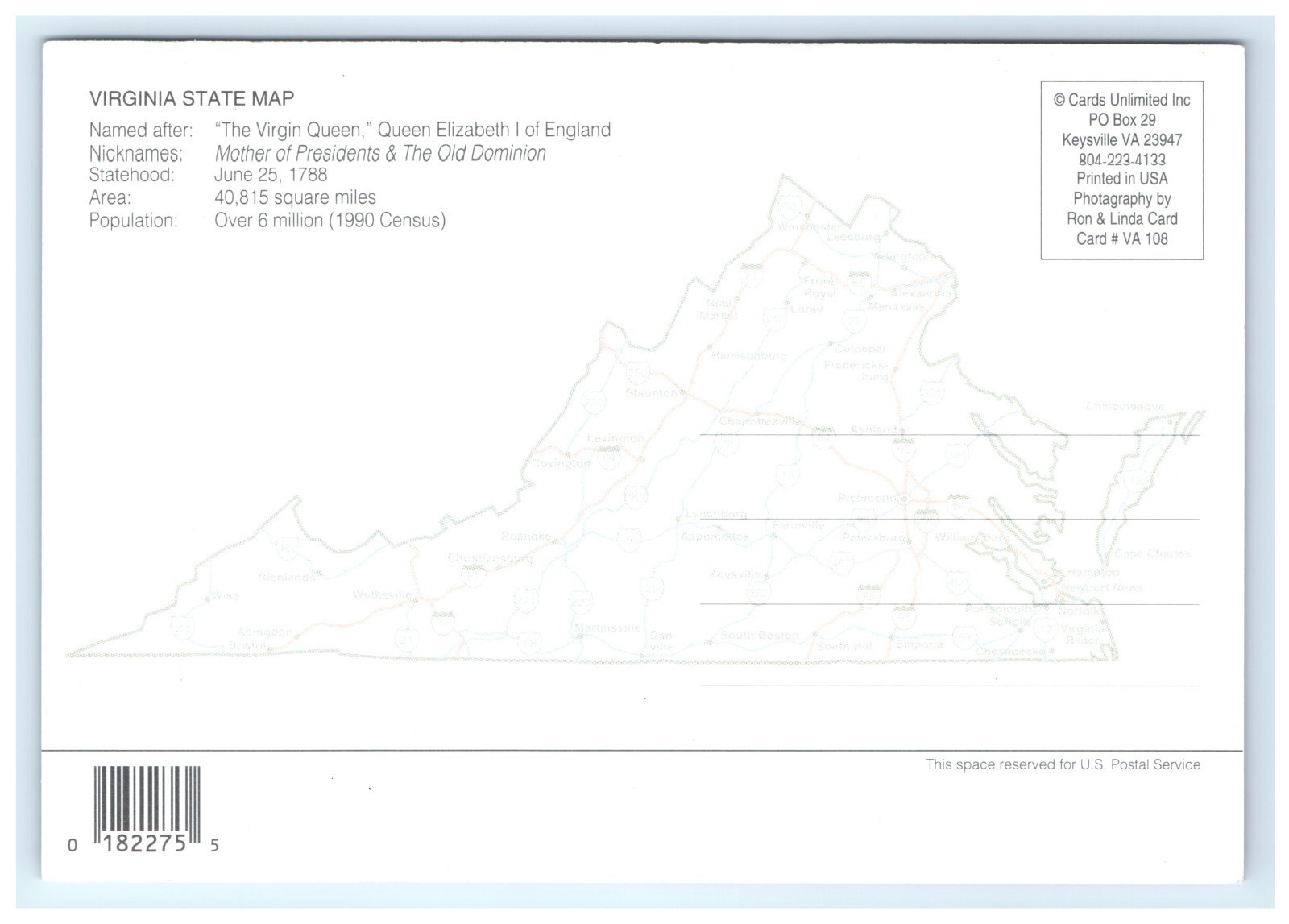 ? Back: Unused. Cards Unlimited Inc., PO Box 29, Keysville, VA. Printed in USA. Photography by Ron Linda Card. Card Number VA 108.