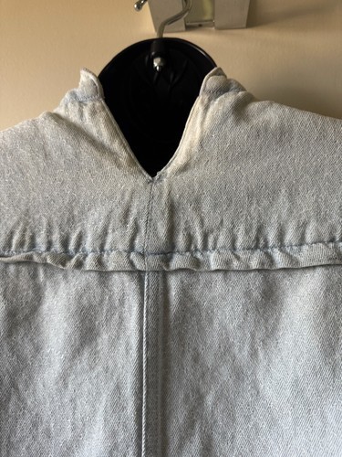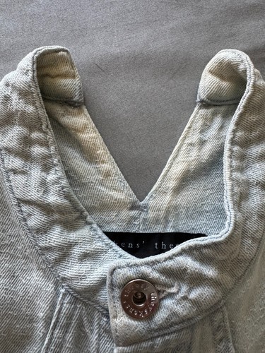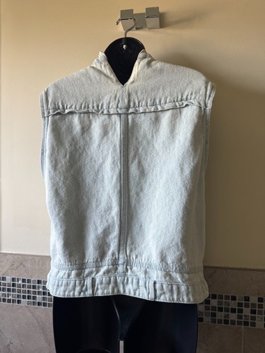 This Theysken's Theory pale blue denim vest is in excellent pre-owned condition with no signs of damage aside from some discoloratio at neck (as shown in photo). It features: