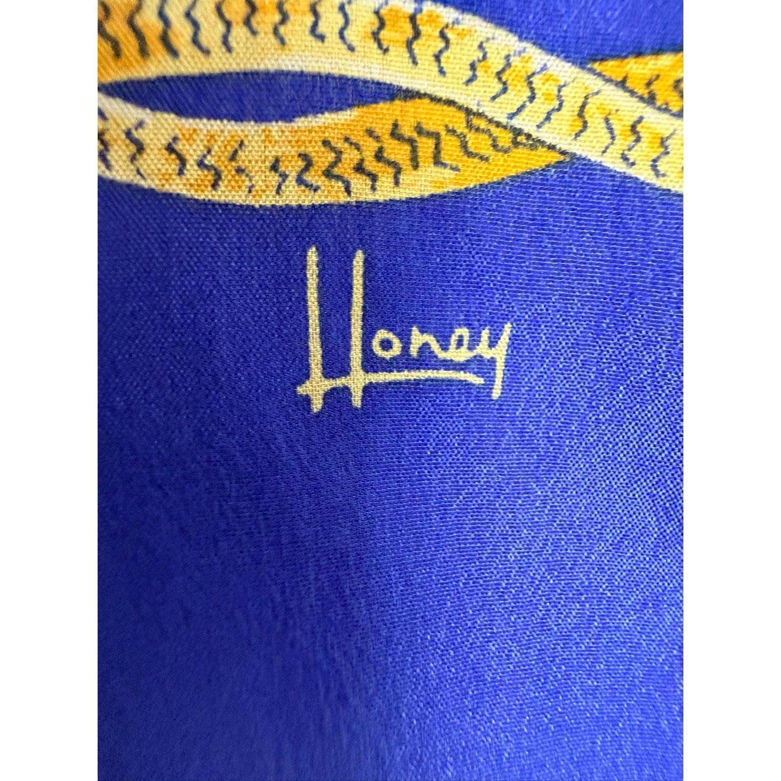 Made in Japan, RN 68079. Known for producing high-quality silk accessories during the late 1970s?1980s, Honey scarves were beloved for their intricate prints and brilliant color saturation.