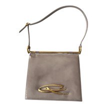 Elegant and rare designer shoulder bag by Christian Lacroix Paris, made in France. This structured piece showcases glossy mauve-taupe patent leather with a faint purple sheen, beautifully contrasted by bold gold-tone hardware and the sculptural Lacroix signature logo. The interior features rich golden satin lining with a zip pocket and embossed leather brand patch.