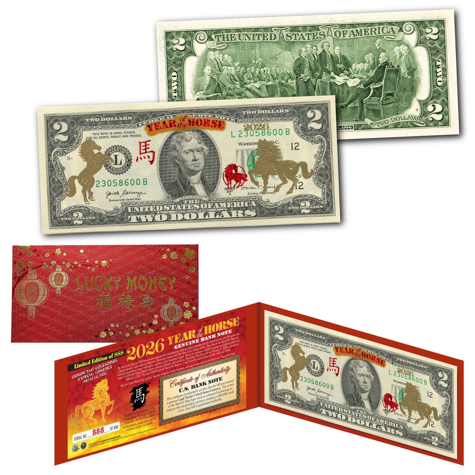 24KT GOLD 2026 Chinese Lunar New Year YEAR OF THE HORSE Genuine $2 BILL - Limited Edition: Only 888 Available!