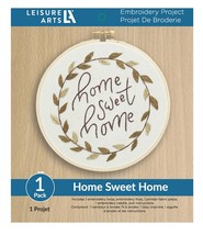 Leisure Arts Home Sweet Home 6 Inch Embroidery Kit 56823. Leisure Arts 6 inch Home Sweet Home 9 piece embroidery project. Printed embroidery design features a circular leafy vine wreath with the caption: Home Sweet Home, in the center. Kit Includes: One 6 Inch Wooden Embroidery Hoop, Embroidery Floss, One Printed Fabric Piece, an Embroidery Needle, and Instructions. CHK-LAK56823