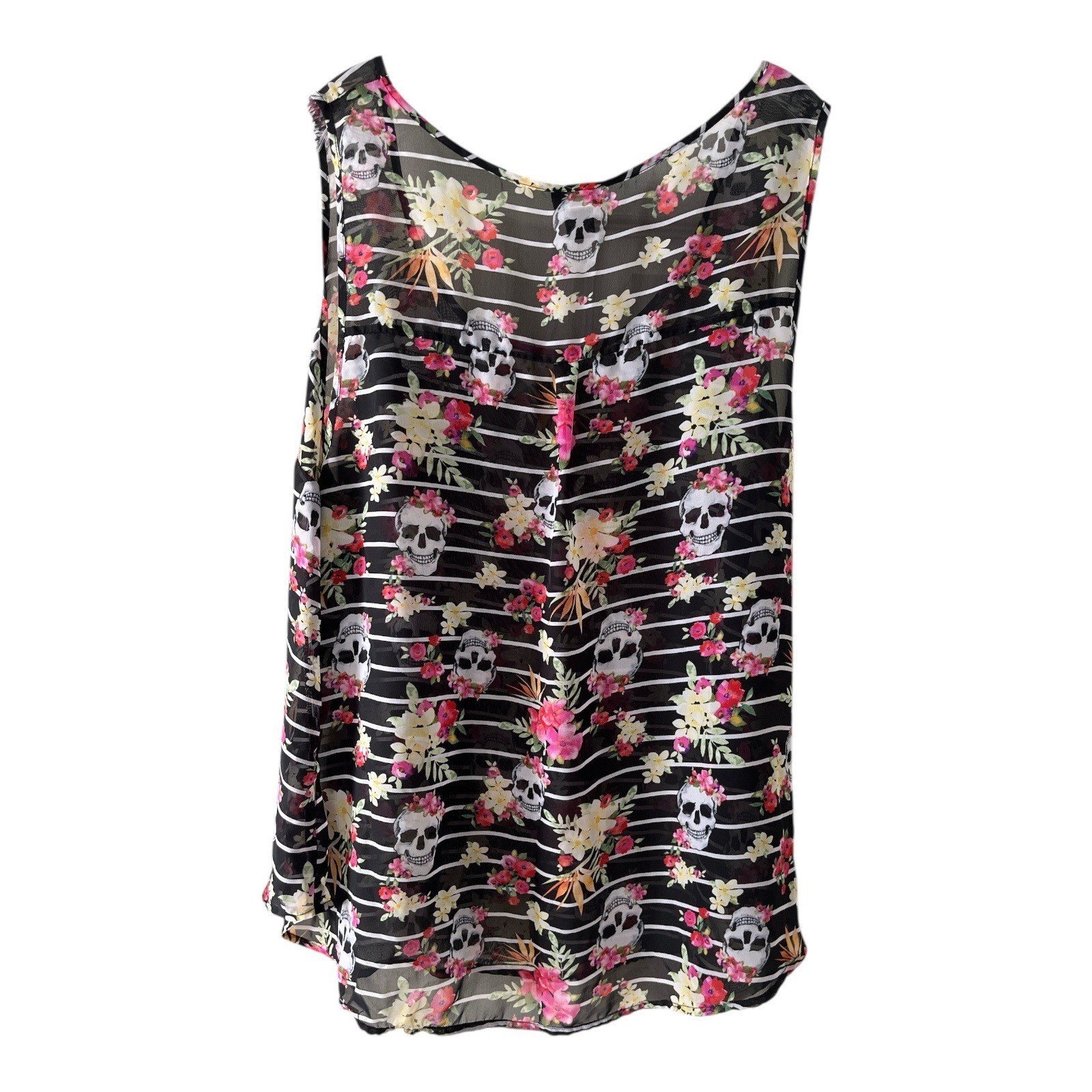 Stylish Torrid sleeveless tank top featuring a bold skull and floral pattern over black and white stripes. Made from lightweight, semi-sheer chiffon with a relaxed drape and scoop neckline. Perfect layered over a cami for an edgy yet feminine look.