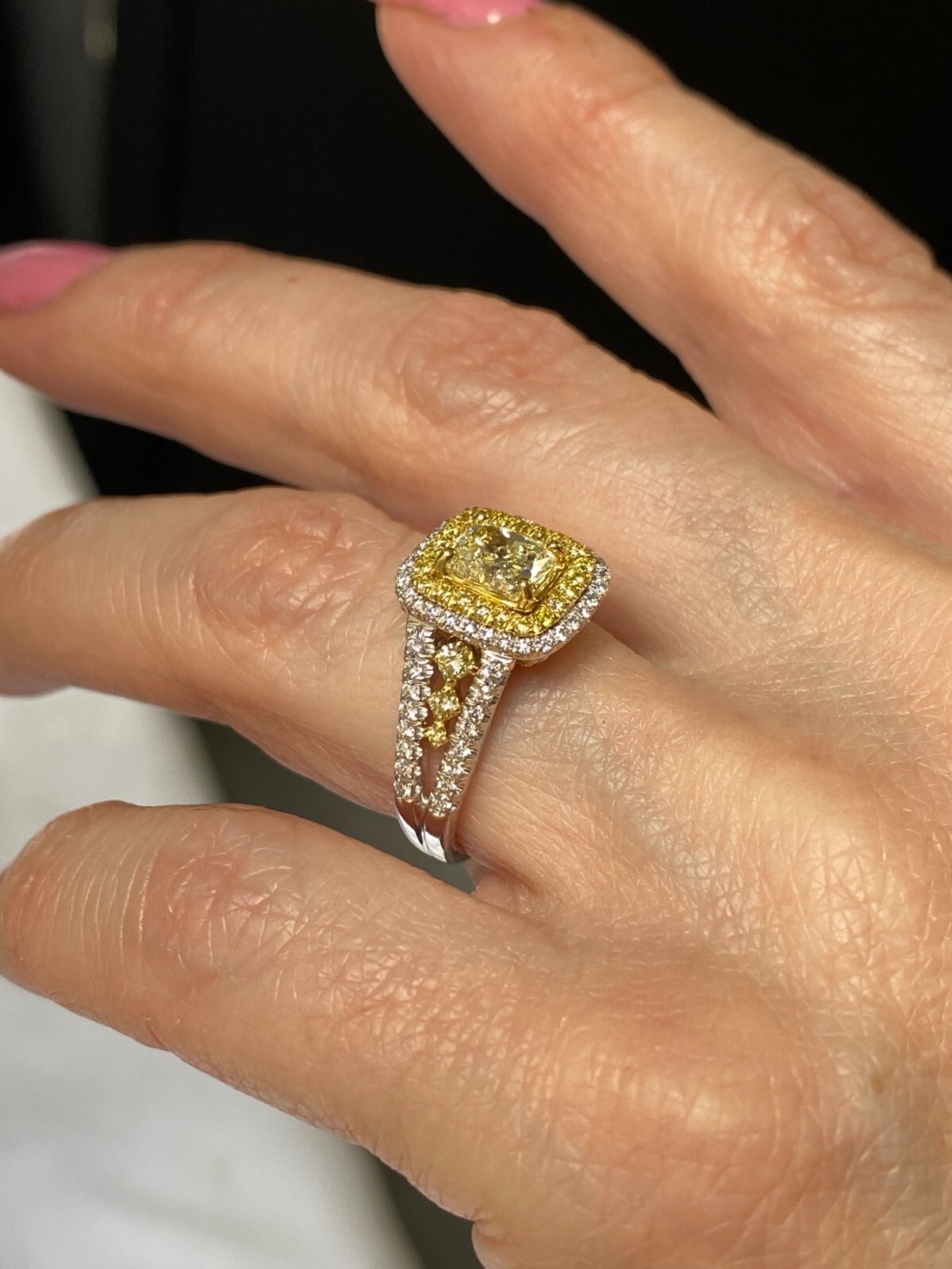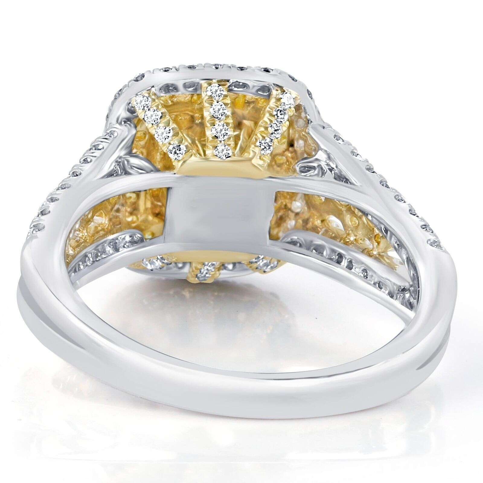 Crafted of 18-karat multi tone gold, the split shank with colorless and yellow graduated diamonds complete a design. The total carat weight is 1.85 carats.