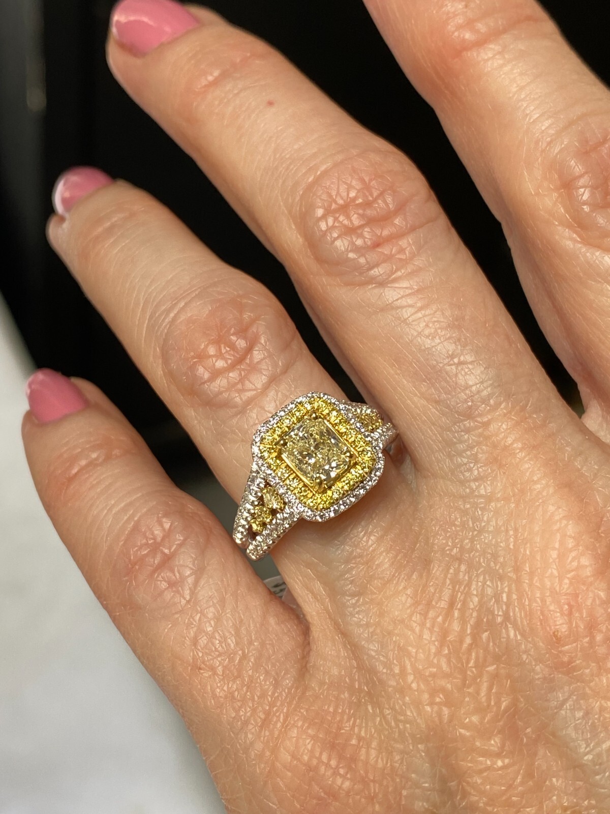 Magnificent diamond engagement ring showcases a 1.01 carat GIA certified very light yellow radiant cut diamond center stone surrounded by a double halo of glittering colorless and yellow round cut diamonds.