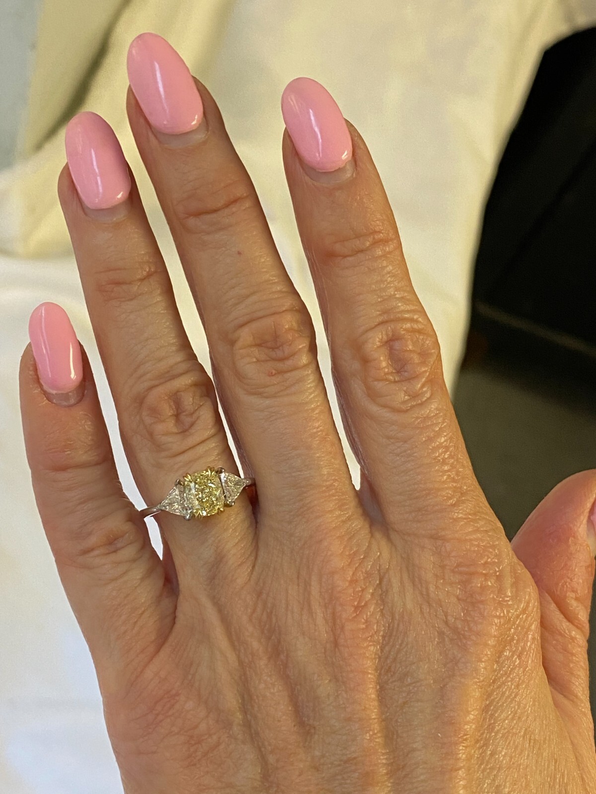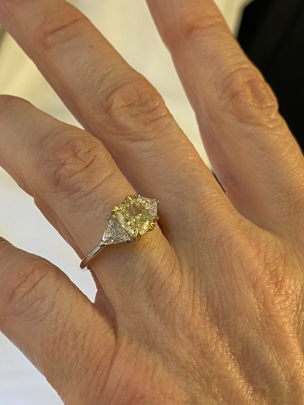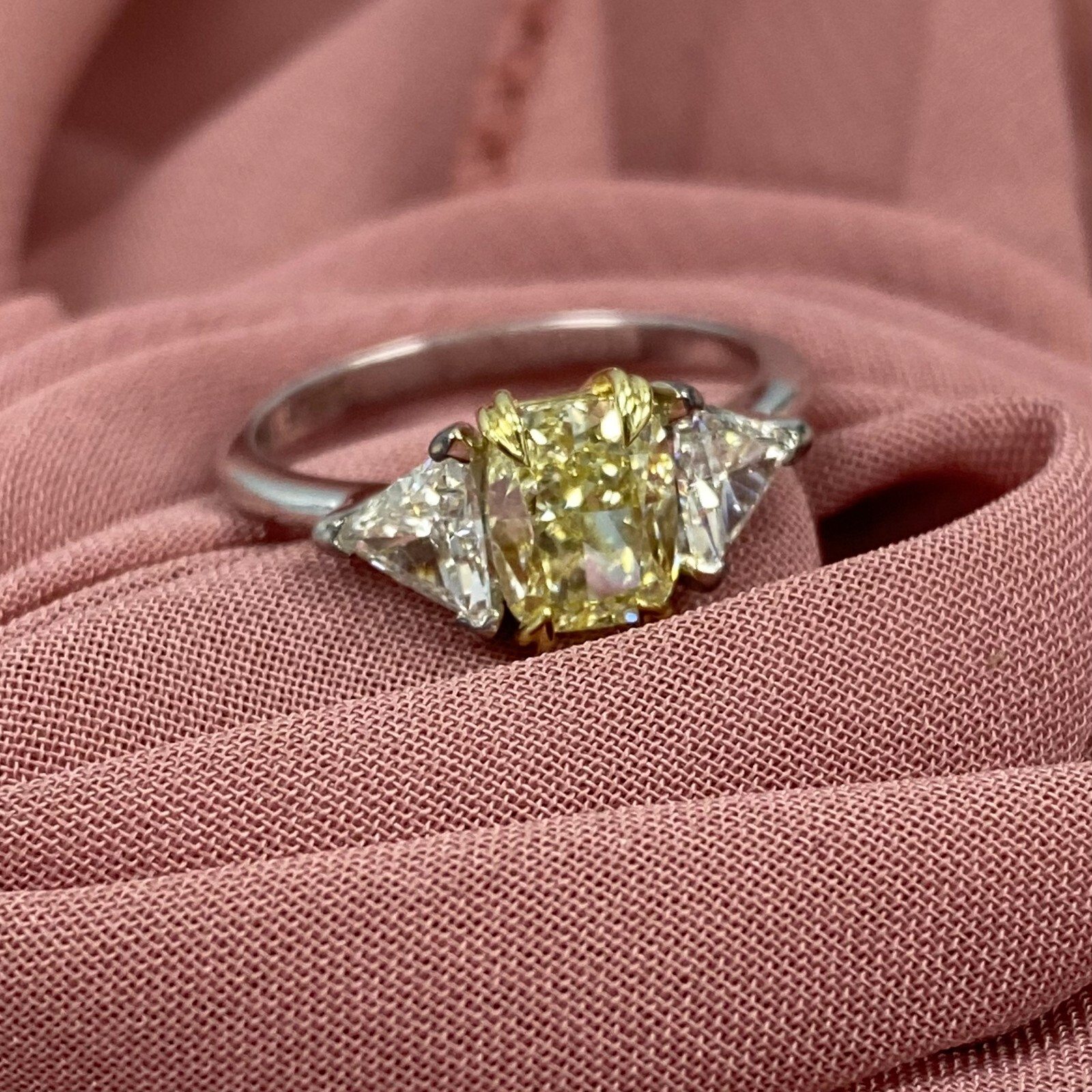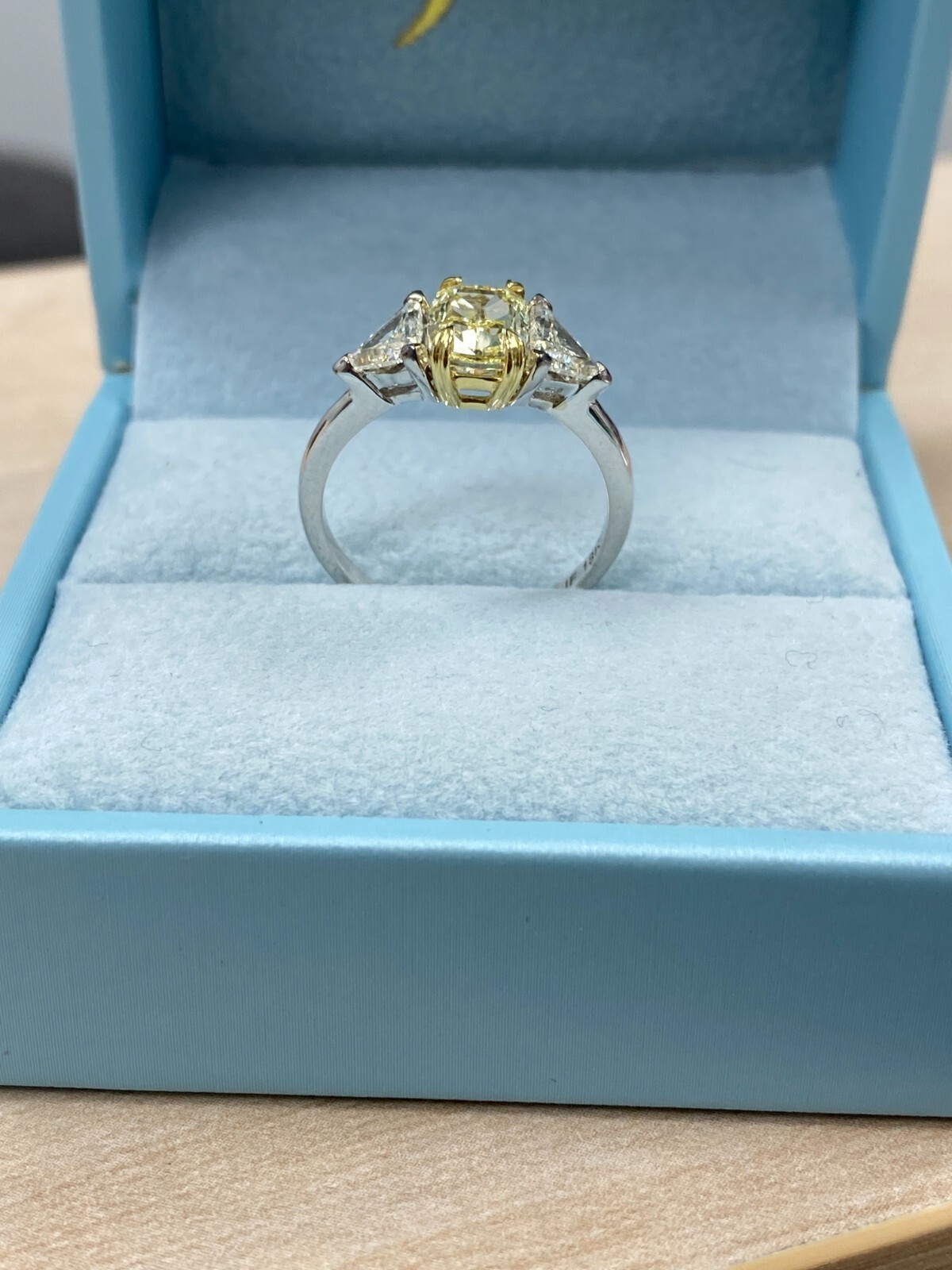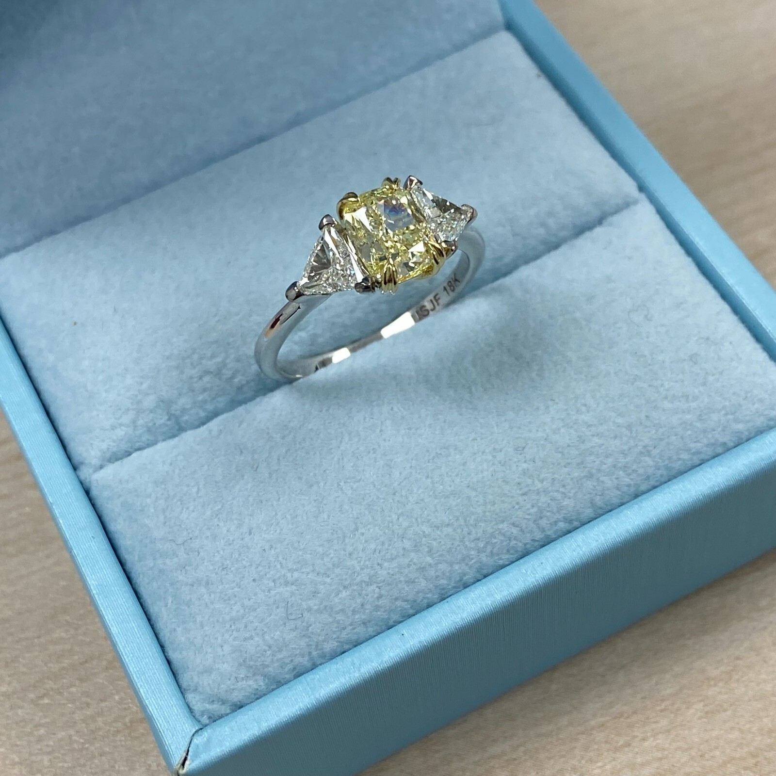 3 Stone GIA Certified 2.13 Ctw Cushion Light Yellow Diamond Ring 18k White Gold