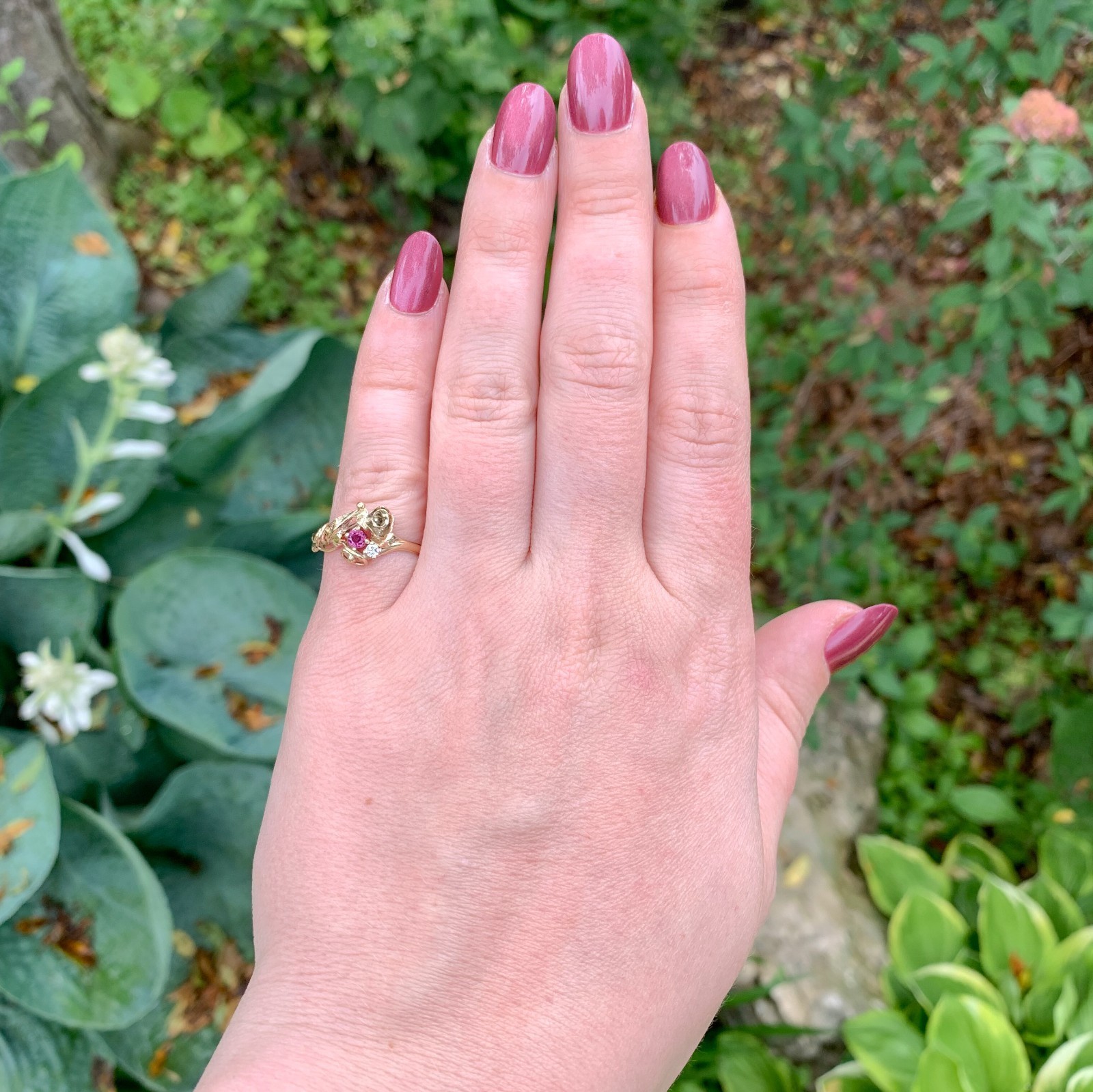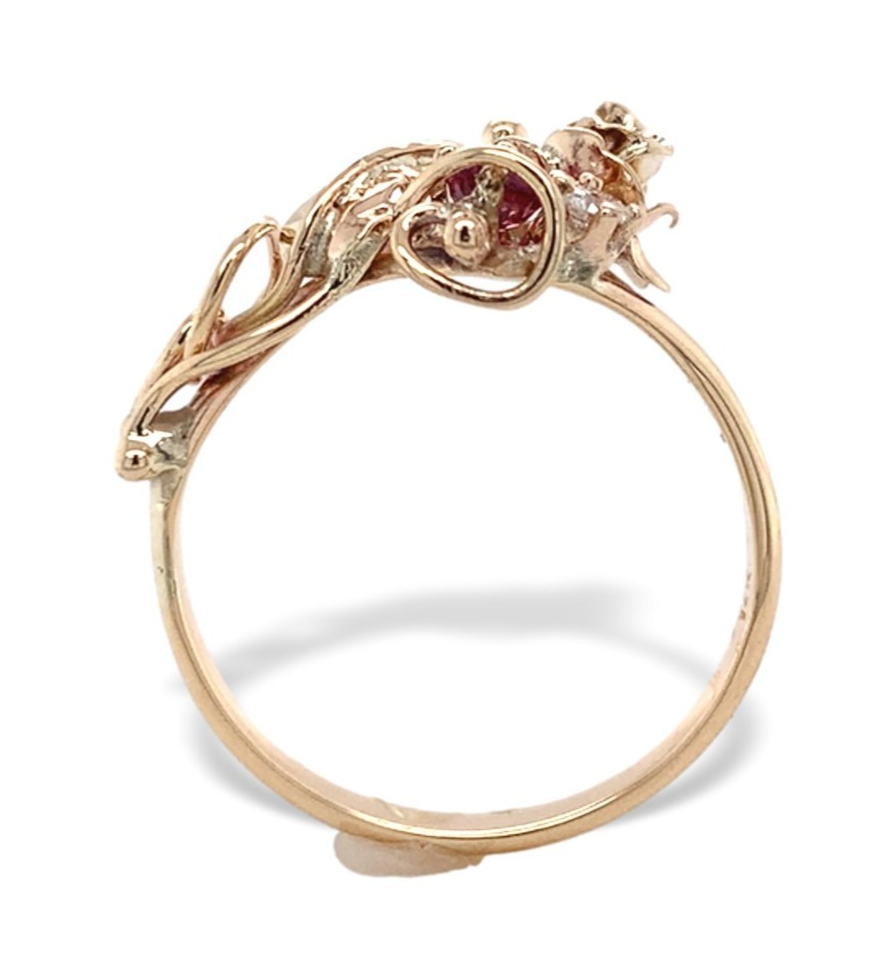 14k Yellow Gold Handwrought Rose Ring with Genuine Natural Ruby Diamond (#J7410)