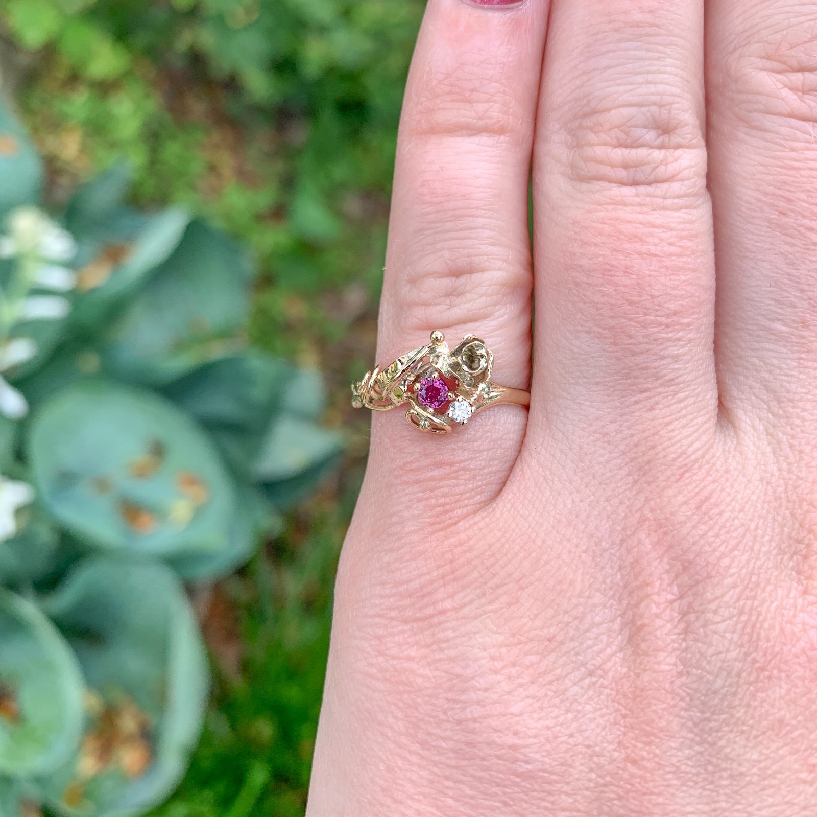 14k yellow gold hand made ring with a rose, applied leaf, and wire work. The ring features a genuine earth mined ruby and diamond. The pinkish-red round ruby measures about 3mm, and the round brilliant cut diamond measures about 2.5mm. The ring fits a size 5.75 finger, weighs 1.28 dwt., and is contemporary with eight rebuilt prongs. Wonderful!
